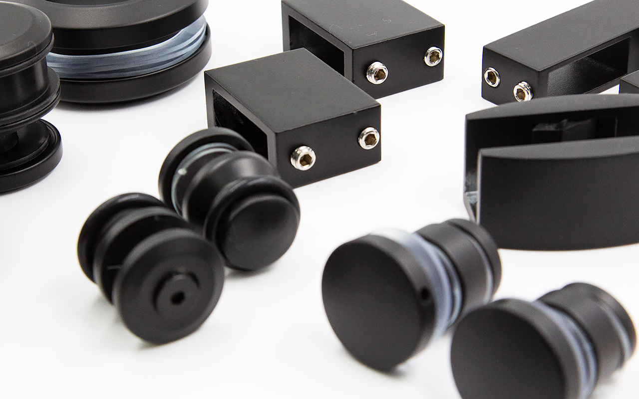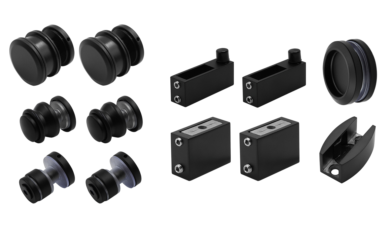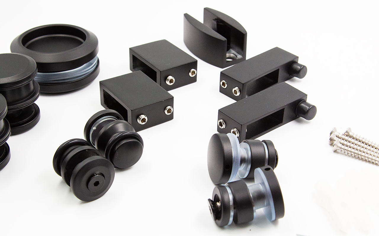 ролик (2 шт.), крепеж стекла к трубе (2 шт.), крепеж направляющая (2 шт.), напольная направляющая (1 шт.), торцевое крепление трубы к стене (2 шт.), стопор (2 шт.), дверная ручка (1 шт.).