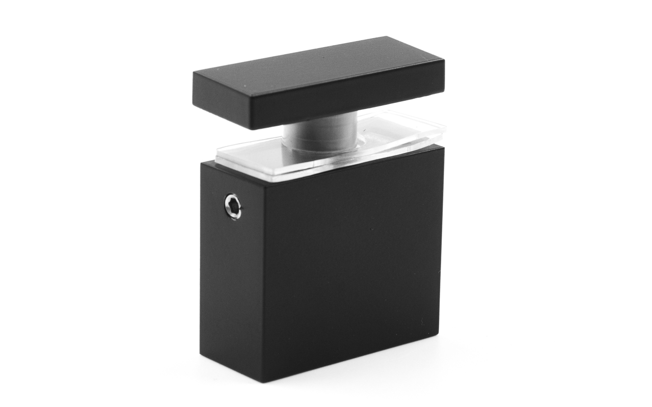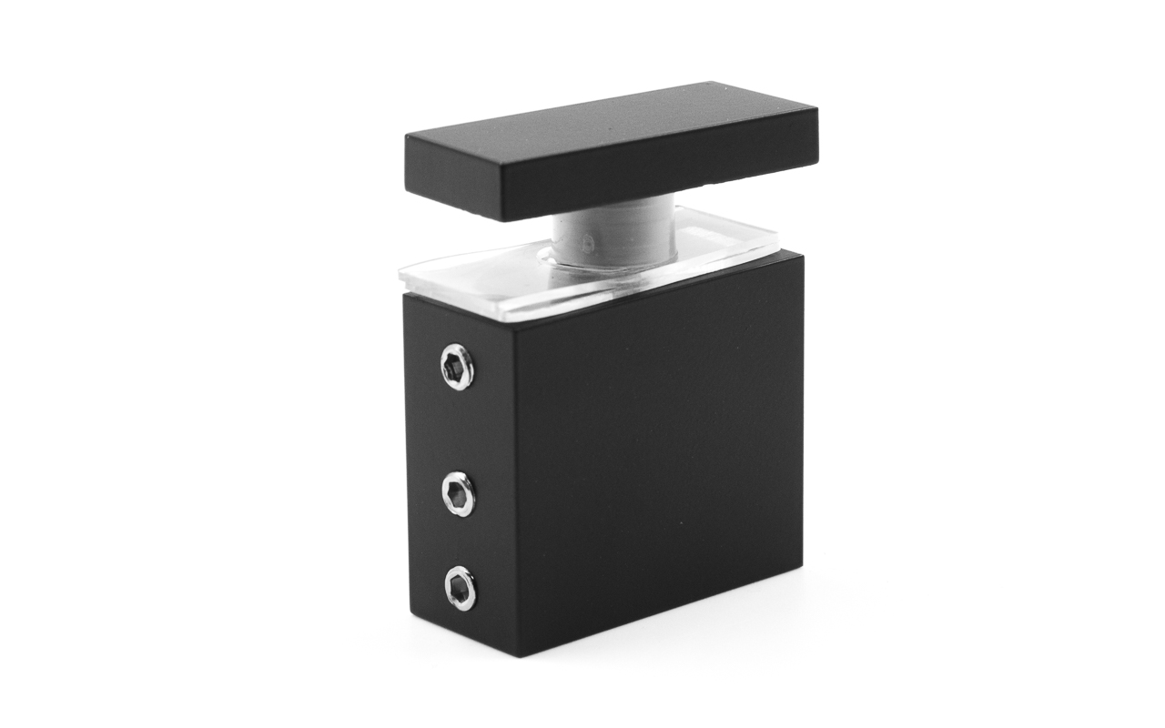 Крепится к стеклу через отверстие 14 мм, соединительные прокладки препятствуют прямому контакту металла и стекла, что способствует сохранению целостности перегородки. Габаритные размеры прямоугольной штанги составляют 30х10 мм