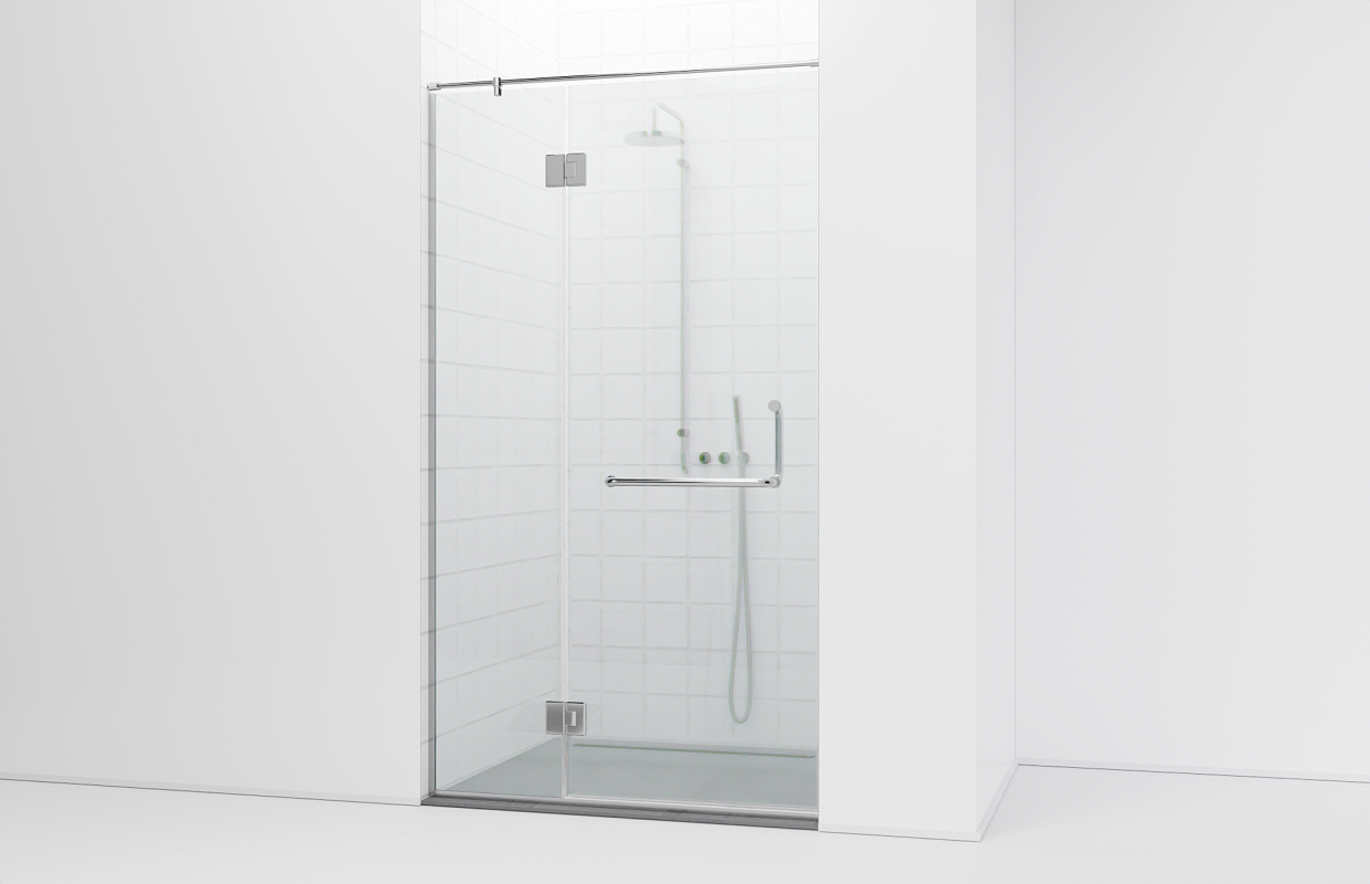 Комплект фурнитуры для душевой перегородки в проеме с распашной дверью. Стекло устанавливается на опорный профиль, сверху фиксируется круглой трубой (штангой). Герметичность обеспечена уплотнителями. Стекло в комплектацию не входит.