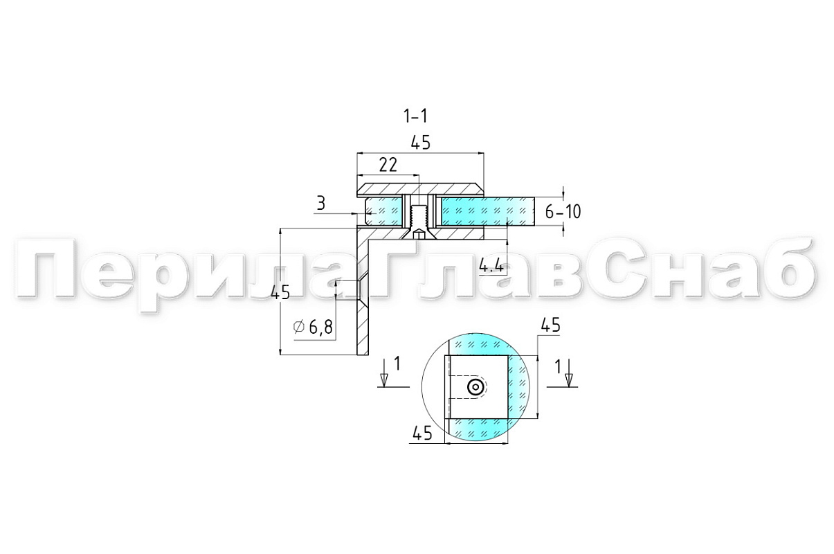 Коннектор для душевой кабины, стена-стекло 90°, 45х45 мм. Материал - латунь-хром, поверхность - полированная