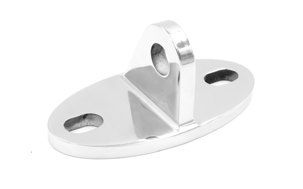 Крепление тяги к стене. Литая, полированная деталь. Состоит из крепёжного элемента с двумя овальными технологическими отверстиями 16,3 на 25 мм для крепления к стене и выносной части с отверстием диаметром 20 мм для крепежа наконечника тяги. Выполнена из стали AISI 316. Ширина детали – 150 мм, расстояние между центрами крепёжных отверстий – 105 мм. Выносная часть выступает на 48 мм от стены.