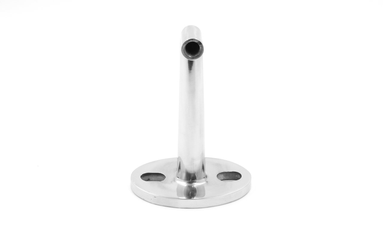 Держатель для подвеса стеклянного козырька (Соединение стена- рутель). Литая, полированная деталь, выполненная из стали AISI 304. Состоит из фланца толщиной 10 мм и шириной 80 мм и дистансера с резьбой М14. Размер дистансера 160 мм от стены до центра отверстия. На основании имеется два овальных крепёжных отверстия размером 16,5 на 25 мм.