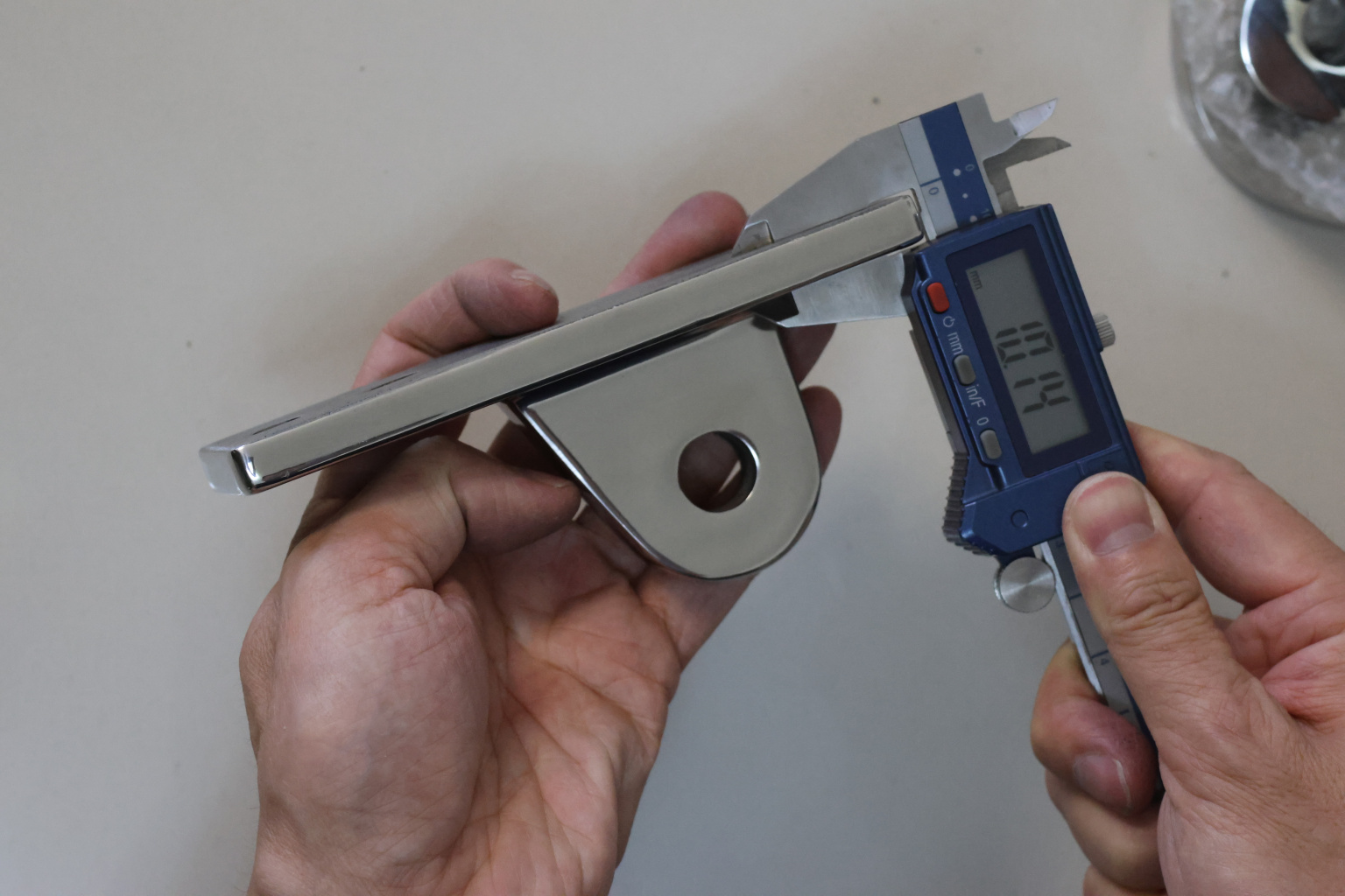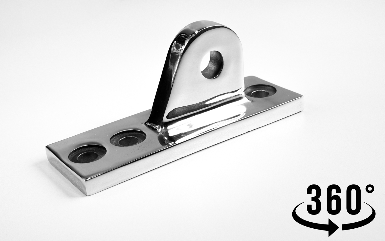 Крепление тяги к стойке. Полированная деталь. Состоит из крепёжного элемента с тремя технологическими отверстиями для крепления к стойке и выносной части с отверстием диаметром 16 мм для крепежа наконечника тяги. Выполнена из стали AISI 304. Ширина детали – 50 мм. Выносная часть выступает на 63 мм от стены.