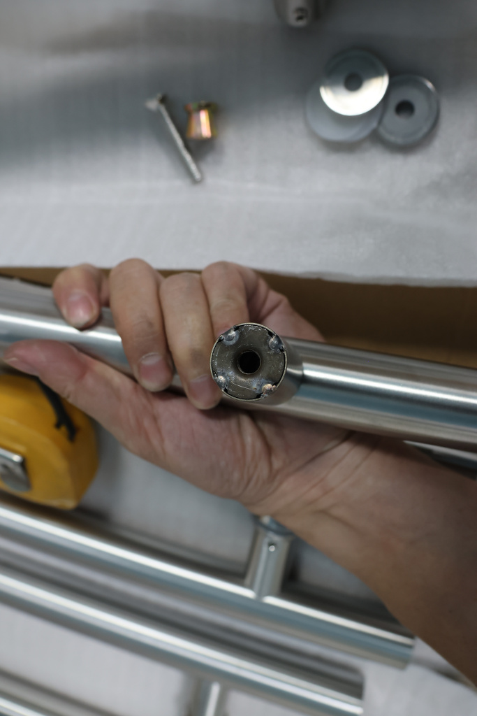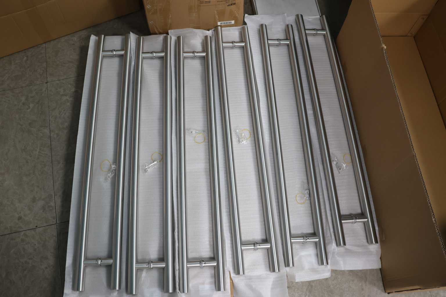 у основания ручки откручиваем с помощью шестигранника винты, делим ручку на две части, в заранее заготовленные отверстия вырезы в стекле 10-12 мм фиксируем первую часть ручки в отверстиях и с обратной стороны ответную часть затягиваем с помощью шестигранника