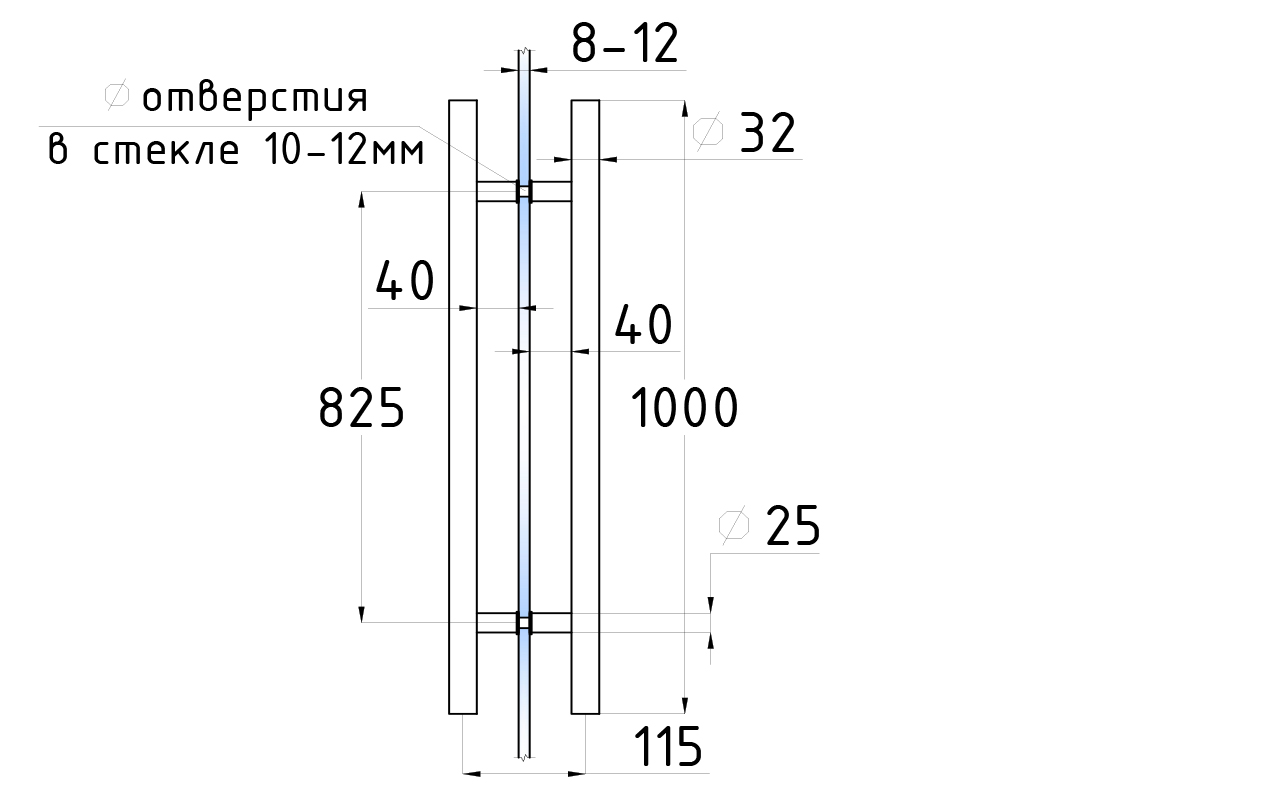 Ручка для стеклянной двери рейлинг двухсторонняя для стекла 8-12 мм, 32х825х1000 мм, шлифованная, марка стали- AISI 304