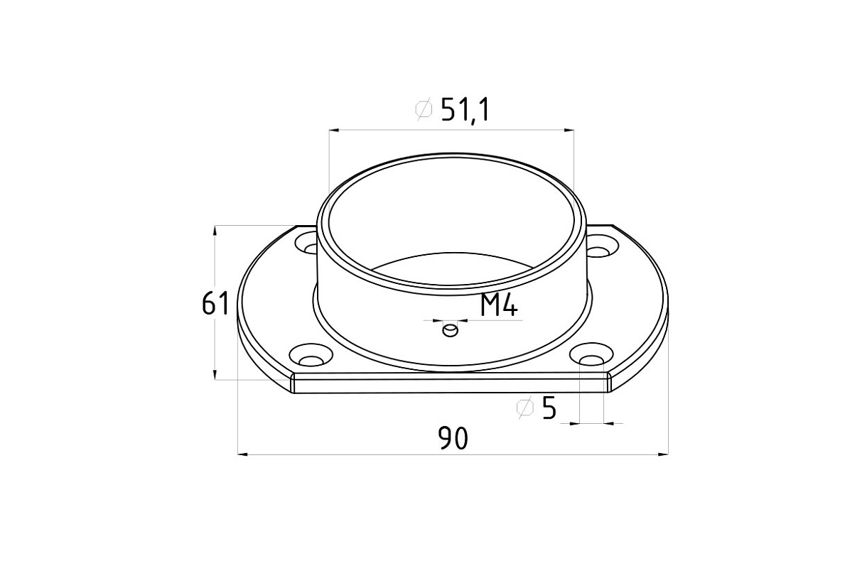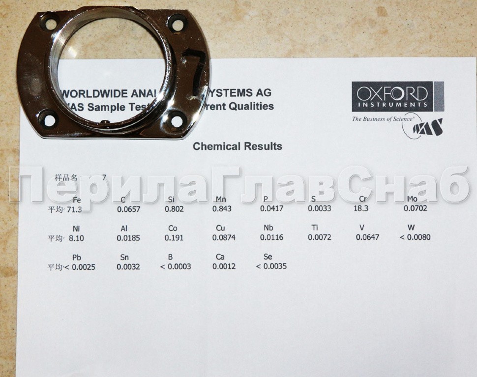 Фланец укороченный, литой, полированный. Деталь с четырьмя отверстиями для трубы диаметром 50.8 мм. Марка стали- AISI 304