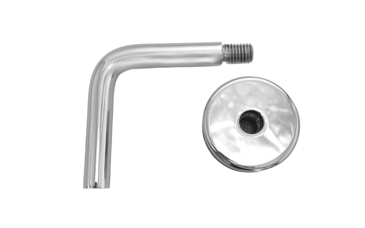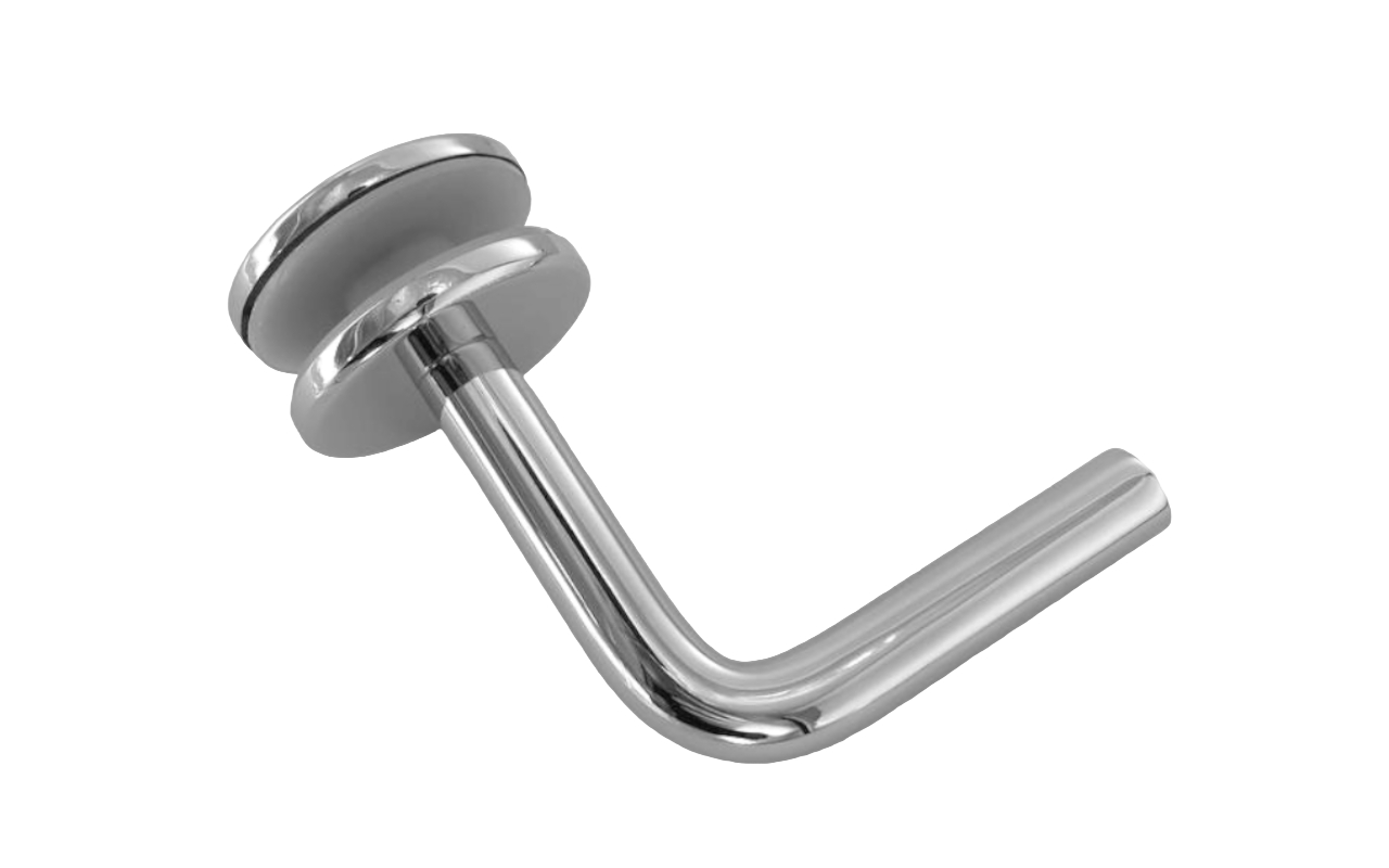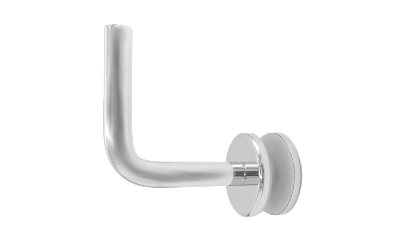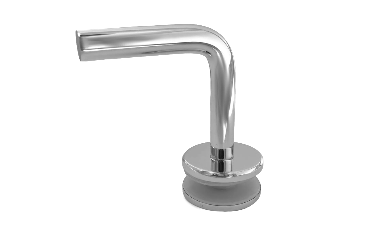 Для установки бокового держателя в стекле сверлится отверстие Ø17 мм, затем пристенок фиксируется затяжной гайкой в торце фланца. А сам поручень приваривается к загнутому наконечнику фитинга.