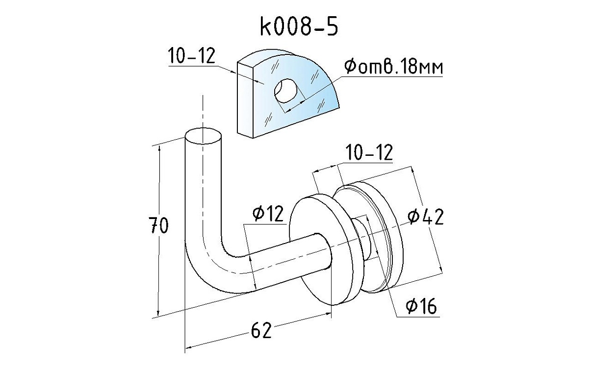 Держатель поручня к стеклу, вынос 60х70, Ø43х5 мм для стекла 10-12мм, (AISI 304) k008-5