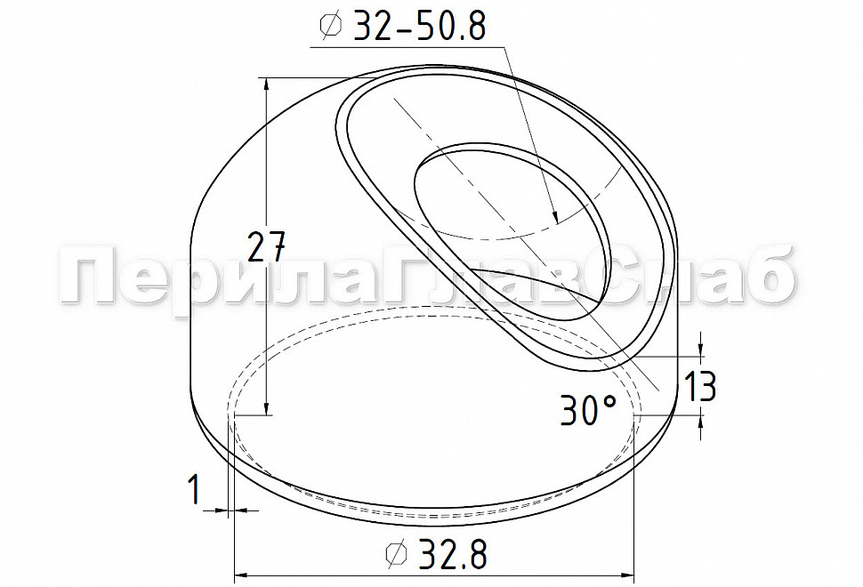 Наконечник штампованный (СПС) косой 30° на трубу Ø32 мм, для поручня Ø38.1-50.8 мм, полированный, нержавеющий, AISI 304, k550