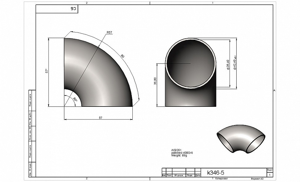 Предназначен для поворота нержавеющего поручня Ø42.4 мм и толщиной стенки 1.5 мм стальных ограждений любого типа. Знакомая всем без исключения сварщикам-аргонщикам и монтажникам деталь применяется во время монтажа практически постоянно. Это и завязка поручня ограждения на повороте марша, и так называемый подскок поручня, и выход в горизонт. Всем нужна, проста, понятна. Сечение кромки отвода представляет собой круг, поэтому так нужна эта деталь во время монтажа, ведь если загнуть трубу, а потом отрезать, то сечением кромки будет овал. Но как его состыковать во время сварки с ответной частью? Ведь в месте стыковки, после среза, сечением второй детали может быть круг, а может быть овал, но вдобавок ко всему развернутый уже под другим углом, а то и вовсе, находящийся в другой плоскости. Поэтому конструкторами нашей компании была разработана именно эта модель сварного отвода специального размера для завязки нержавеющего поручня ограждения на узких лестничных маршах.