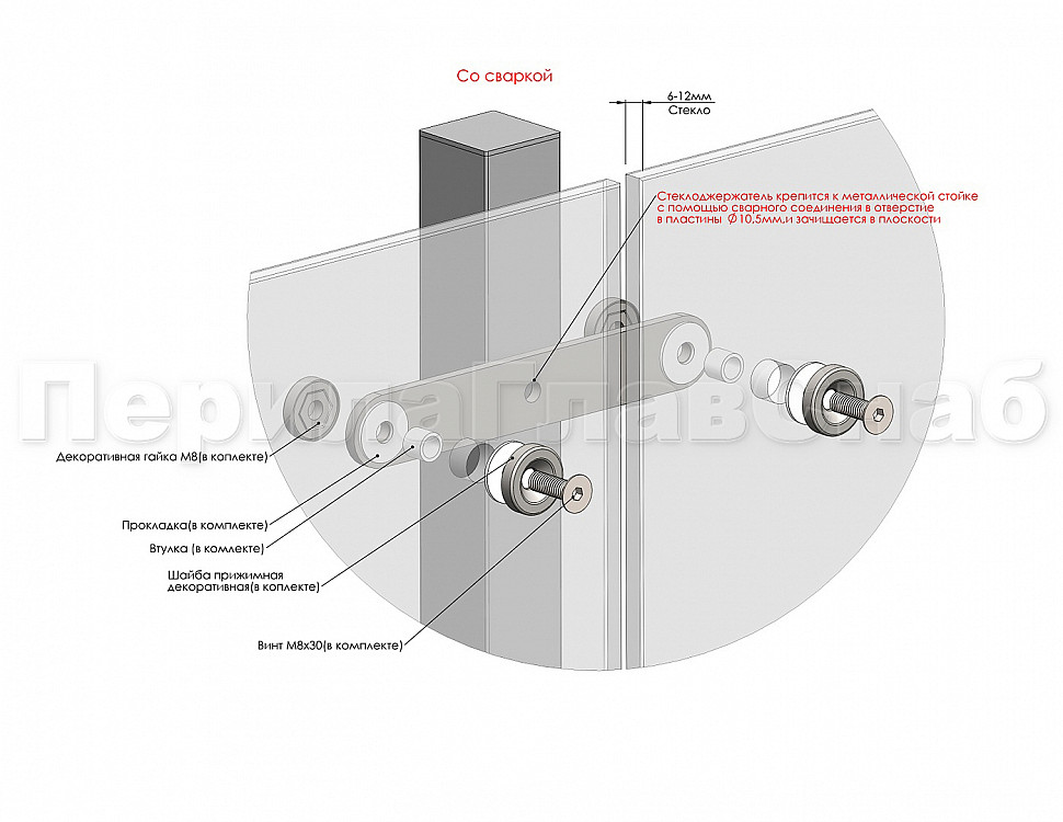 Основное отличие предлагаемой нами модели от аналогов — это увеличенная длина пластины. Те, кто уже работал со стеклом, знают, как трудно поймать малейшее отклонение линейных размеров стекла, особенно на наклонных лестничных маршах. При этом отклонение может возникнуть как в случае изменения длины или ширины стекла во время изготовления, так и при смещении оси просверленных в стекле отверстий под винты стеклодержателей. Избежать этого практически невозможно, так как двух абсолютно одинаковых стекло на свете не бывает. А вот запас по длине обеспечивает возможность более простой, а значит быстрой установки стекла на ограждение во время монтажа. При этом нивелируется отклонение осей отверстий в стекле. Мы рекомендуем подваривать элементы между собой, чтобы их не расхитили вандалы или злоумышленники.