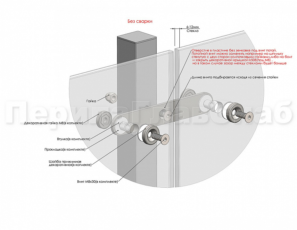 Стеклодержатель пластинчатый штампованный (толщ. 5 мм, ширина 30 мм), полированный, 3 отверстия М8, по центрам 85+85 мм=170 мм. В комплекте 2 штампованные шайбы 25х4х0.5 мм, 2 винта М8, предназначены для стекла 6-12 мм. Для более толстого стекла нужно докупать более длинные винты М8. Пластиковые втулки k503для стекла в комплект не входят. Наличие наклонных маршей или поворотов не является припятствием для применения пластинчатых стеклодержателей. А вот стекло нужно подготовить - сделать заранее отверстия под винты стеклодержателя. Благодаря более четкой и жесткой фиксации стекла в пластинчатых стеклодержателях, исключается риск выпадения стекла, как это может произойти в случае применения зажимных стеклодержателяей.