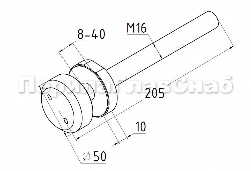 Стеклодержатель Ø50х10х18, шпилька М16х205 мм, для стекла 8-40 мм, с возможностью регулировки выноса до 65 мм, для торцевого крепления стекла, полированный, литой, точечный.