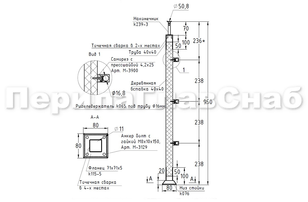 Стойка для пандуса: под 2 поручня Ø38,1-50,8 мм для инвалидов, 2 ригеледержателя, полированная, высота 900 мм, AISI 304 k750-6 купить в Уфе