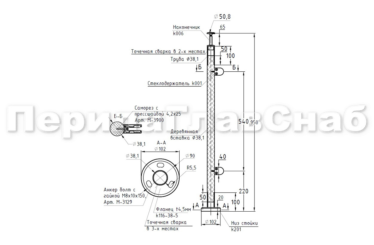 Готовая стойка Ø38,1 мм, с фланцем и наконечником, высота 950 мм, полированная (AISI 304) k702