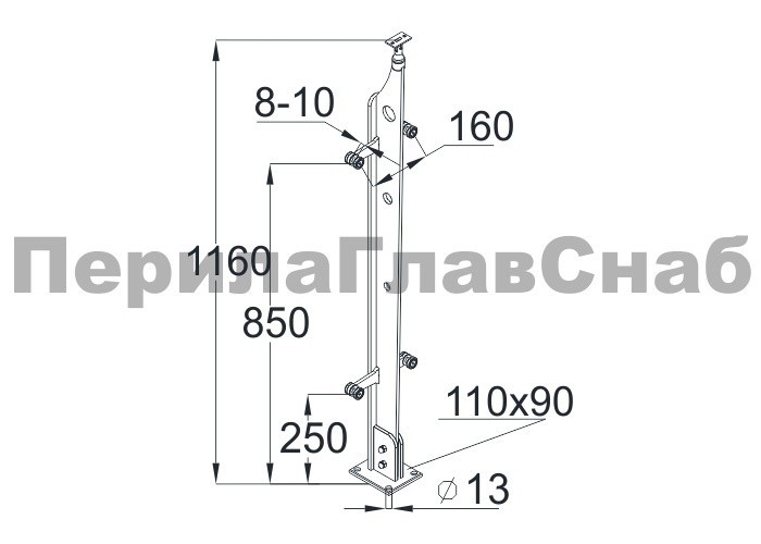 Стойка круглая Ø38.1: 2 литых зажимных стеклодержателя, под стекло 8-10 мм, полированная, высота 950 мм (AISI 304) k722-L купить в Уфе
