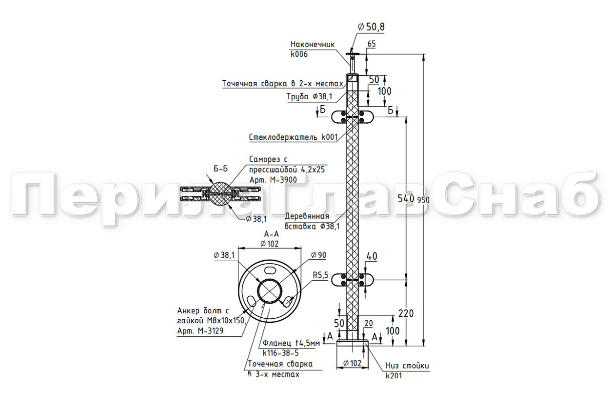 Готовая стойка Ø38,1 мм, с фланцем и наконечником, высота 950 мм, полированная (AISI 304) k702