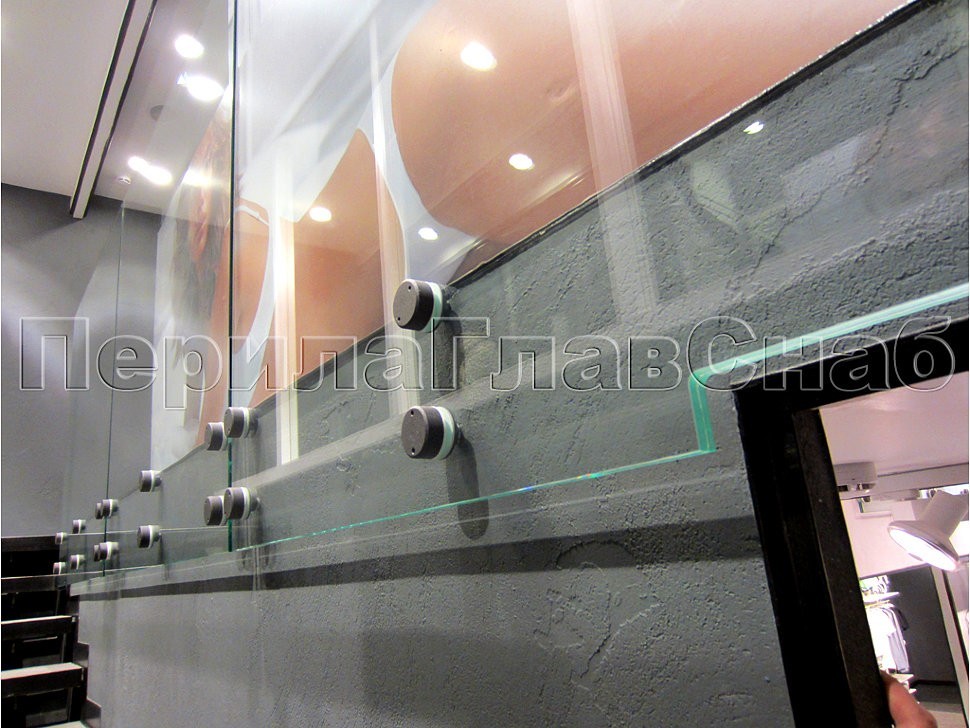 Конструкция ограждения вызывает интерес, прежде всего, торцевым способом крепления стекла, так как была острая необходимость сохранить, как можно больше свободного пространства. В итоге нам удалось оставить ВСЮ площадь галереи неприкосновенной, как раз за счет торцевого крепления стекол ограждения.