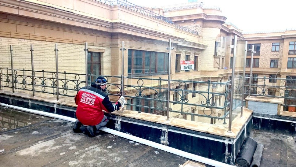 Конструктора совместно с инженерами и дизайнерами «ПерилаГлавСнаб» разработали специальные плоские миниатюрные стойки из полированной нержавеющей стали (с высокой несущей способностью) и фитинги соединения стекол между собой в стиле стоек для большей жесткости и надежности конструкции. Это решения заказчик принял, так как оно полностью подходило его требованиям: практически нет металла (полированная нержавейка растворяется в пространстве) и ничто не мешает созерцать красивый городской пейзаж.