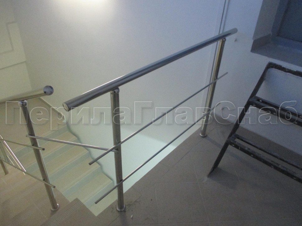 Бюджетное решения для внутренних лестниц. Стойки и поручень из круглой полированной трубы 38 мм. Ригели 12 мм установлены на сварке. Для жесткости ограждения отдельных маршей и ограждения горизонтальных участков связанны небольшими отрезками 12 мм трубы.
