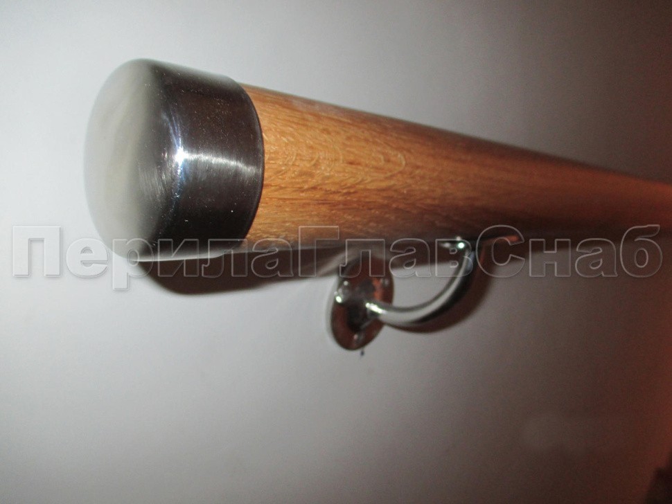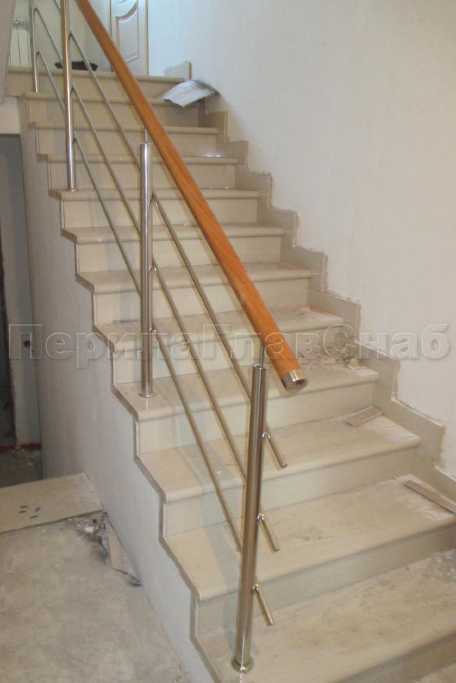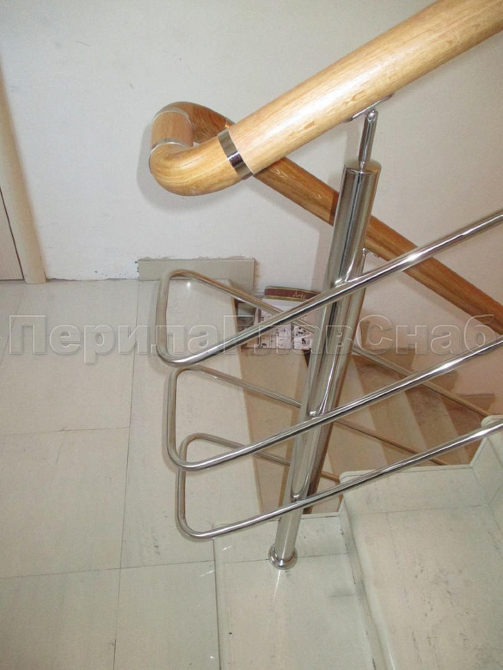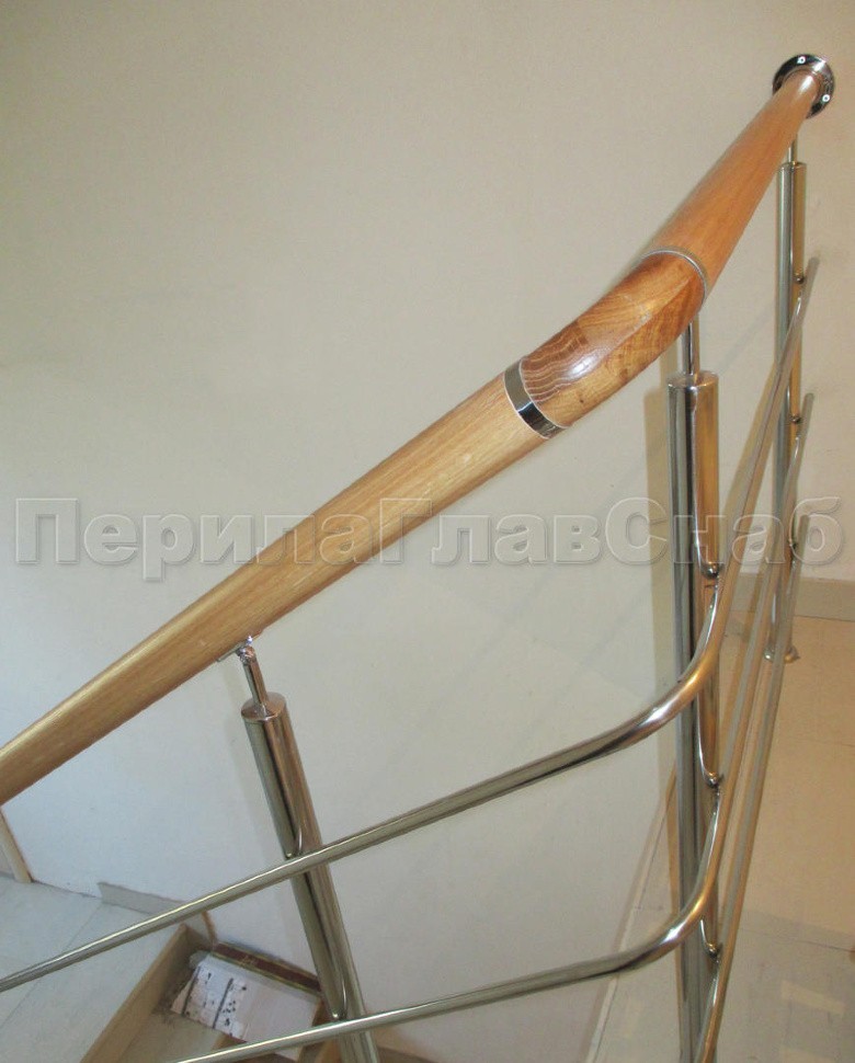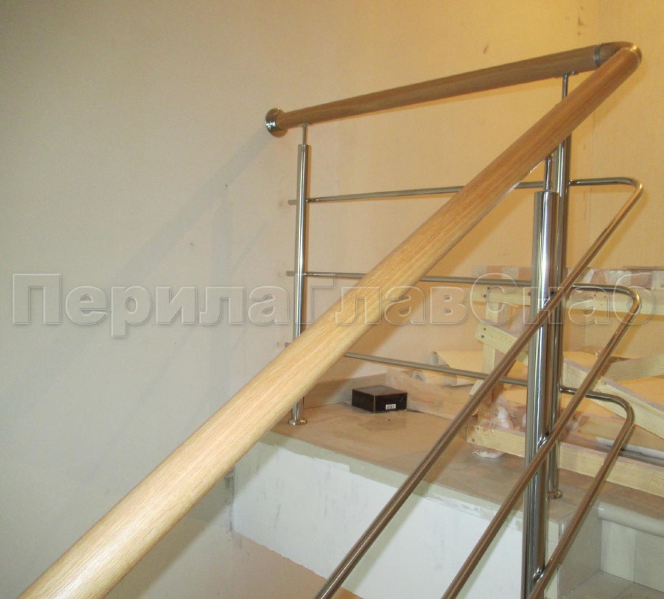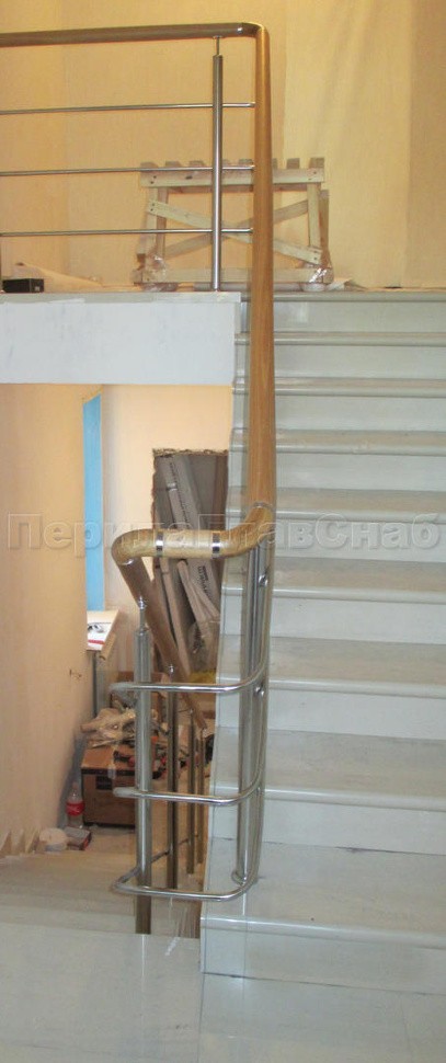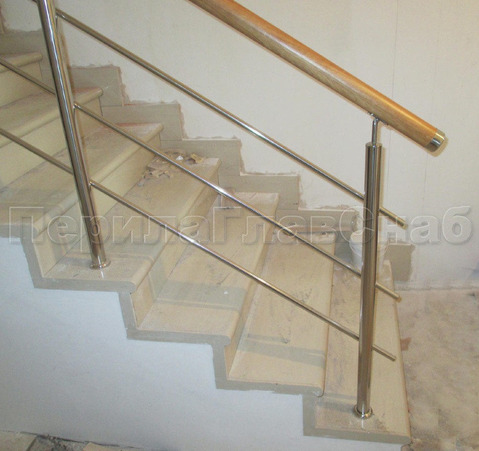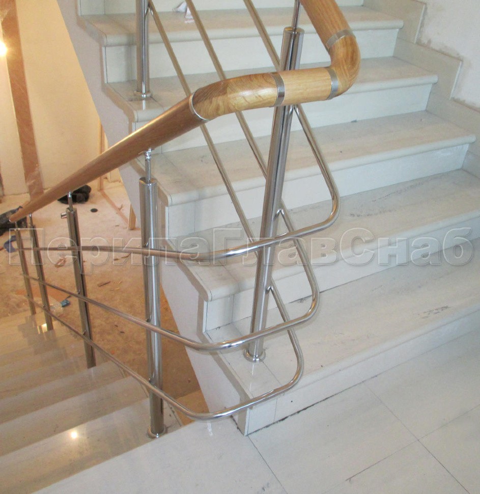 Было установлено нержавеющие ограждение маршевой лестницы с тремя ригелями. Поручень из белорусского дуба со специальной обработкой с сохранением текстуры. Поручень круглый (49 мм) с тремя поперечными склейками и продольными склейками. Такой поручень очень надежный и прослужит долгое время. Стойки устанавливались безударным бурением на химический анкер. Поручень и ригели для удобства, безопасности и жесткости конструкции завязаны на повороте.