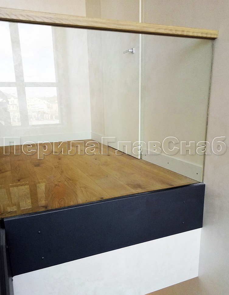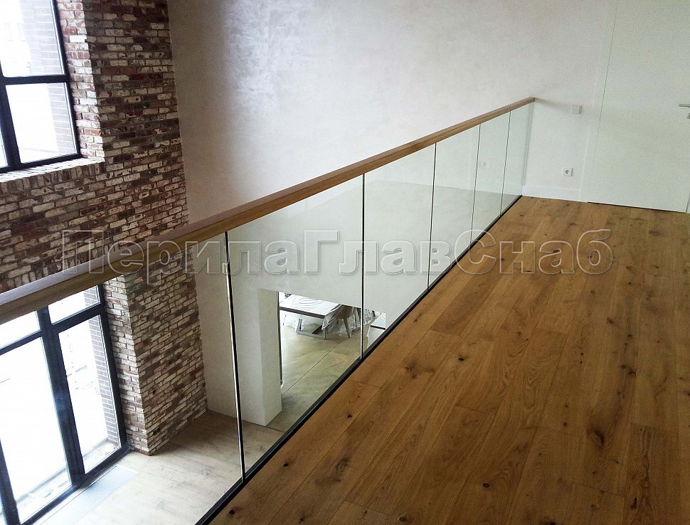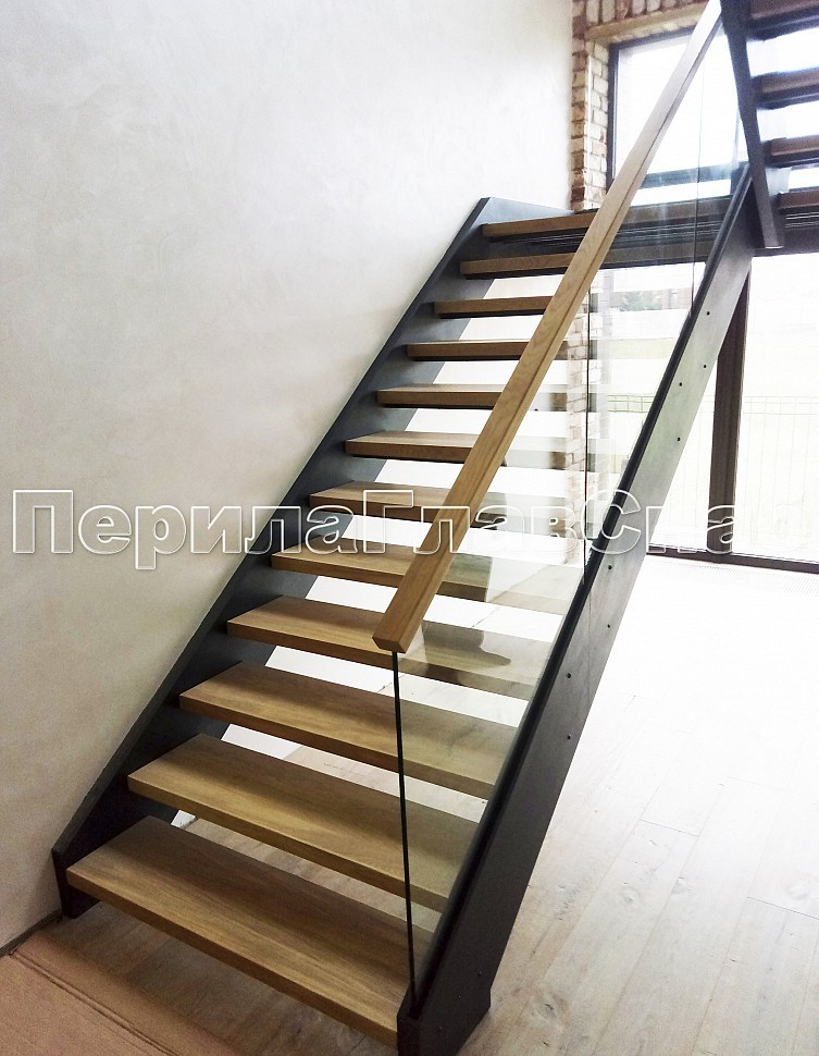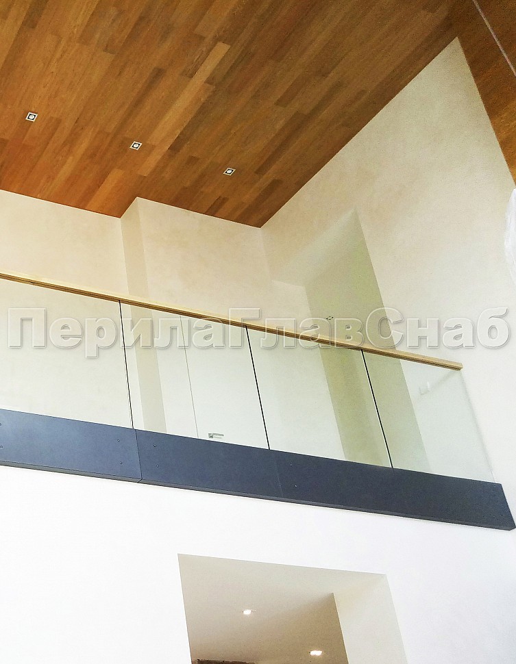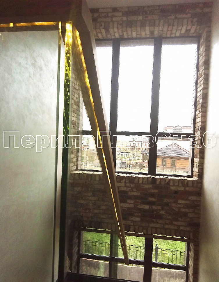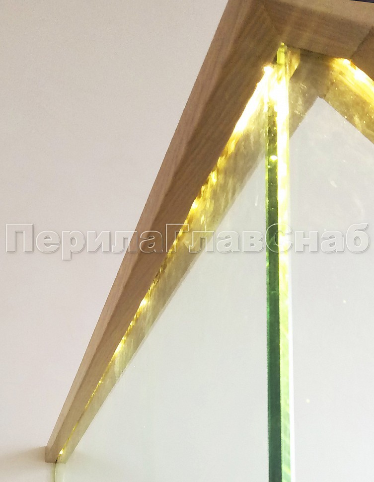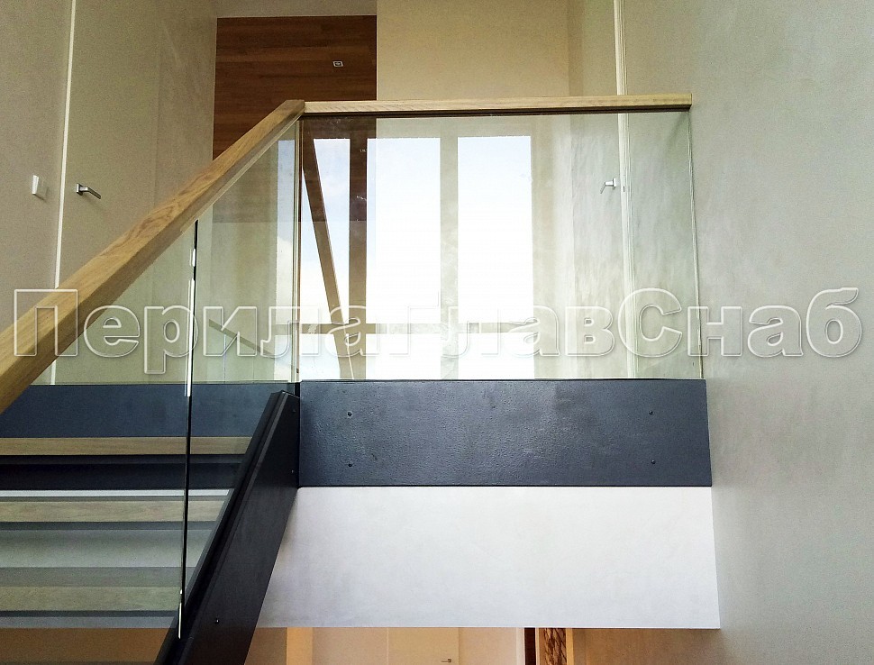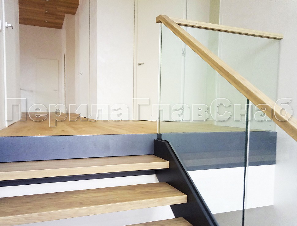 Цельностеклянное, стекло каленое 12 мм, на точечном креплении с декоративной накладкой из стального листа с покраской. Поручень из массива дуба 60х40мм., с пазом на стекло и с подсветкой светодиодной лентой.