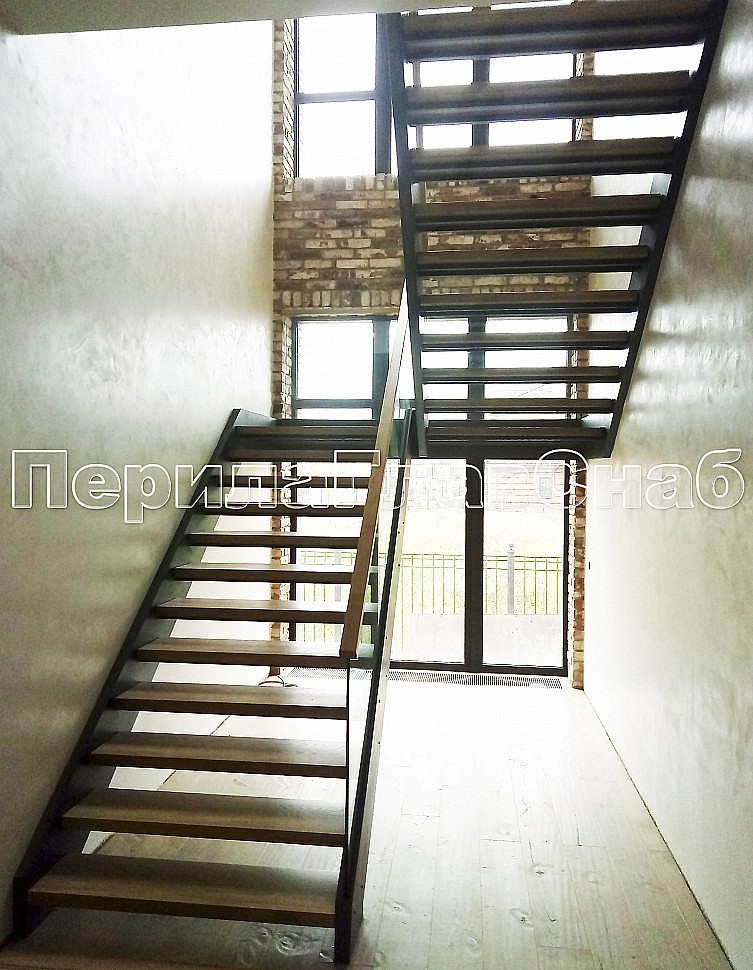 Лестница состоит из двух маршей с промежуточной площадкой на двух тетивах. Тетивы выполнены из листов стали с системой зажима стекол и декоративными накладками, соединены между собой методом электросварки профильными трубами. После электросварки, тетивы, профильные трубы и декоративные накладки, прошли процесс шпаклевки мест электросварки и неровностей, полной грунтовки и покраски всей конструкции.