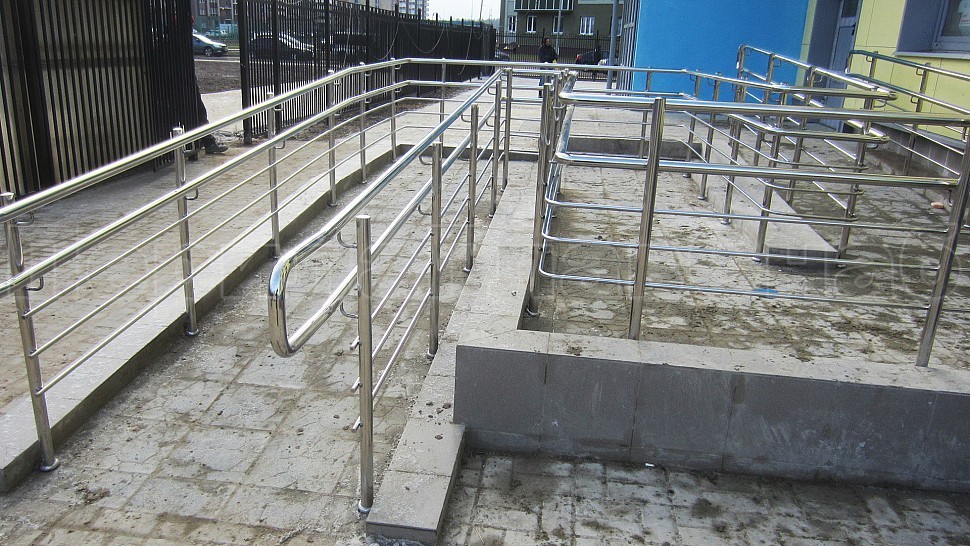 - Стойки пандуса выполнены из полированной нержавеющей стали высотой 900 мм, диаметр трубы составляет 38 мм. Стойки устанавливаются равномерно, расстояние между ними не менее 900 мм, по низам стоек установлена декоративная крышка, ловко скрывающая резкий вход стойки в бетонную поверхность после алмазного бурения диаметром 42 мм. Закрывая почти метровое пространство между стойками, безопасность обеспечивают три ригеля диаметром трубки 16 мм. Ригель крепится к стойке на выносных держателях. Сбоку на стойки крепится поручень из той стали, что и вся конструкция, в горизонте поручень завязан бубликом.