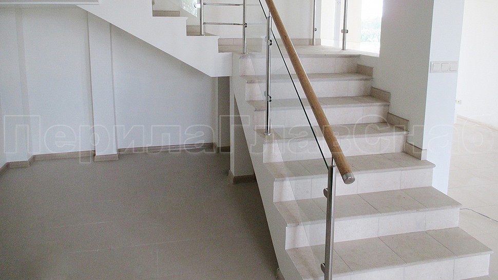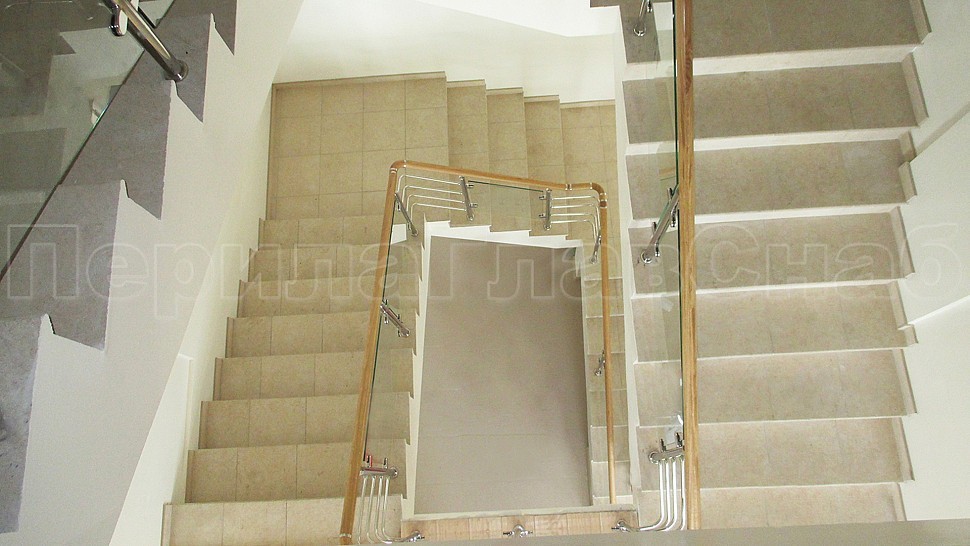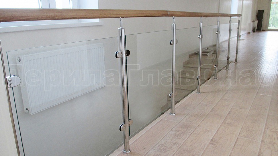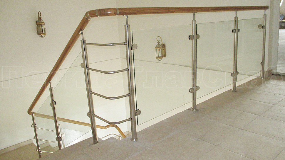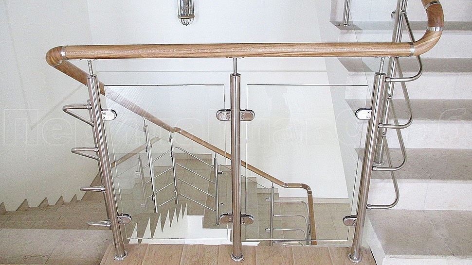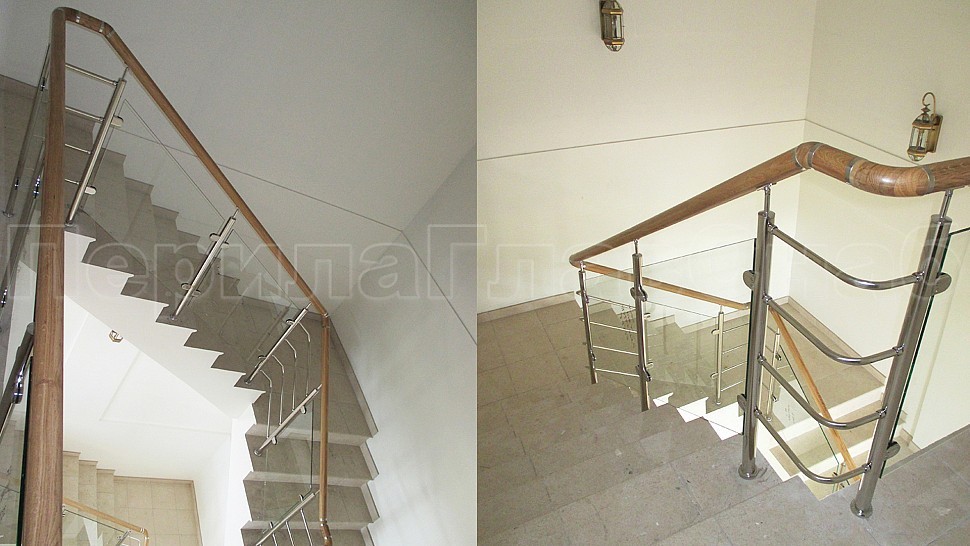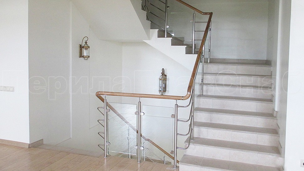 В частный дом было установлено ограждение из полированной нержавеющей стали для колодезной лестницы со стеклом. Со стойками диаметром 38 мм, которые устанавливаются через две ступени на третью, крепятся сверху (сквозь плитку в бетон) бурением с последующим вклеиванием, верх стойки штырь с ложементом для деревянного поручня. Закаленное прозрачное стекло 8 мм с полировкой кромок по периметру. Стекло крепится к стойкам на зажимных стеклодержателях из полированной нержавеющей стали.