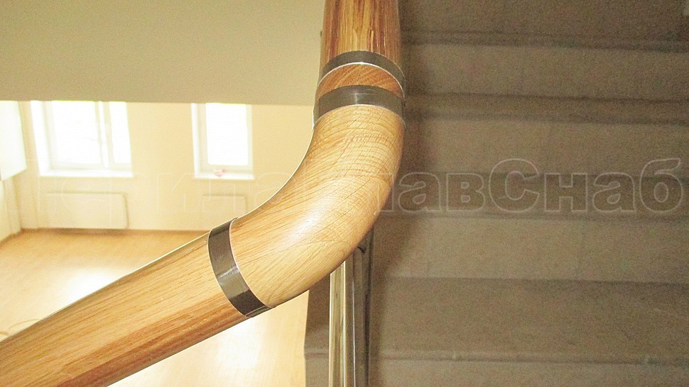 Клееный дубовый поручень, без тонировки покрытый лаком в один слой крепится над стойками. Окончание поручня заглушка из полированной нержавеющей стали. Поручень крепится к держателю поручня на саморезах с полукруглой головкой. Поручень завязан между маршами дубовыми отводами через нержавеющие кольца с круглыми проставками из дуба. Между маршами (на повороте 90 градусов) внахлест на стойки привариваются снизу по четыре ригеля – трубки из полированной нержавеющей стали с забивными заглушками.