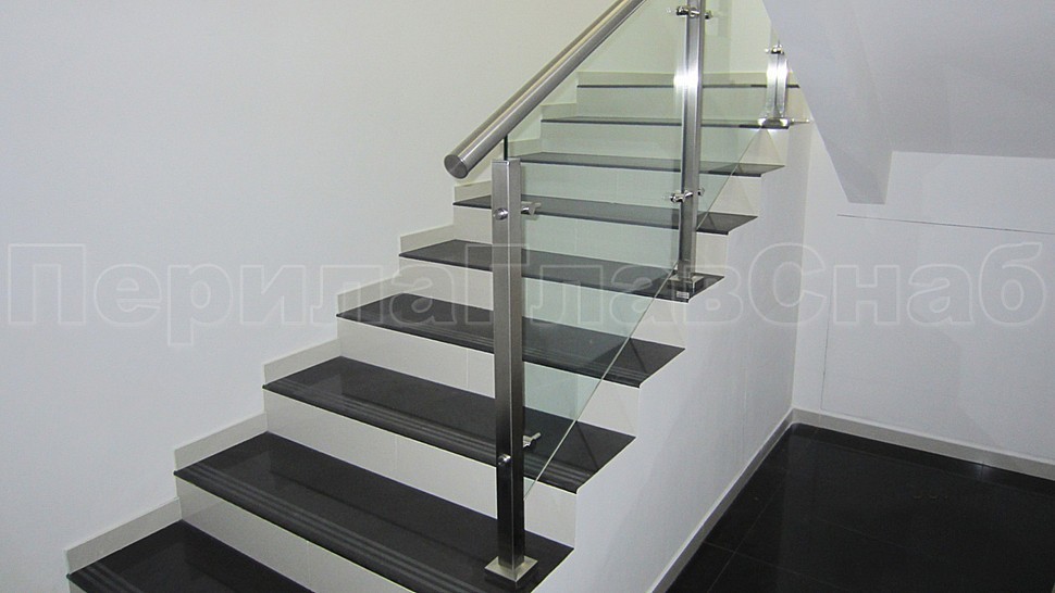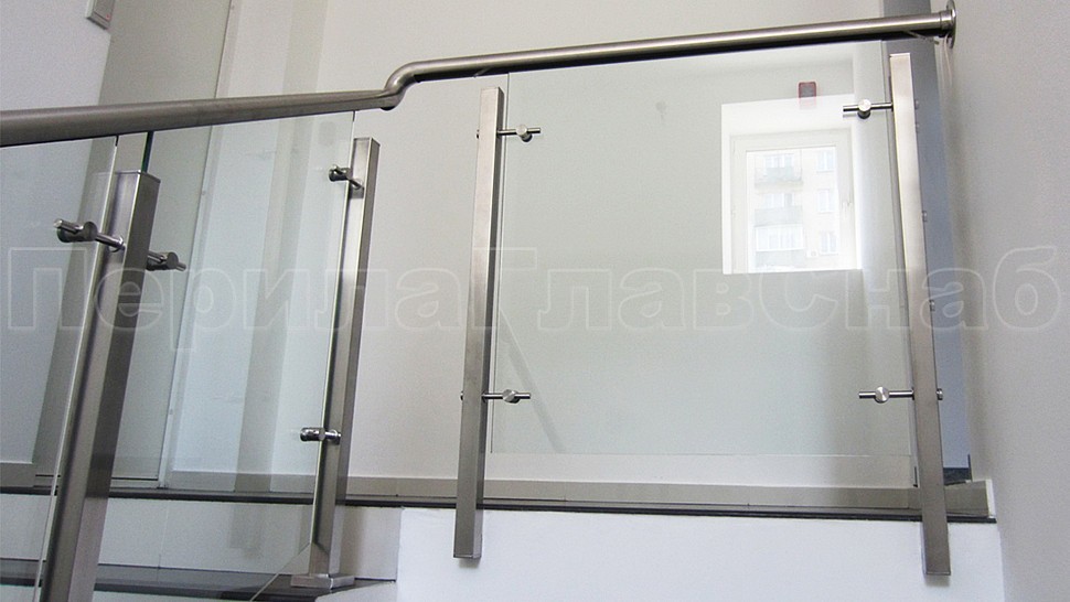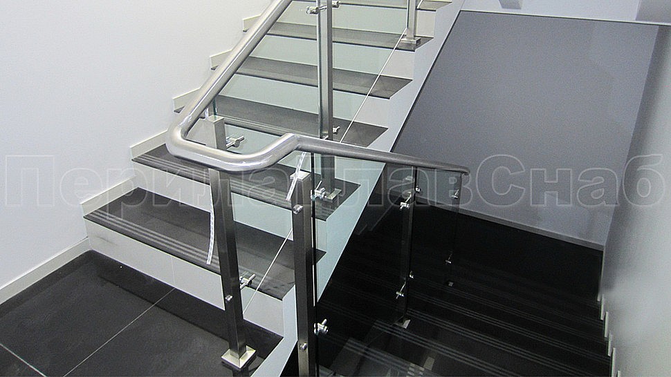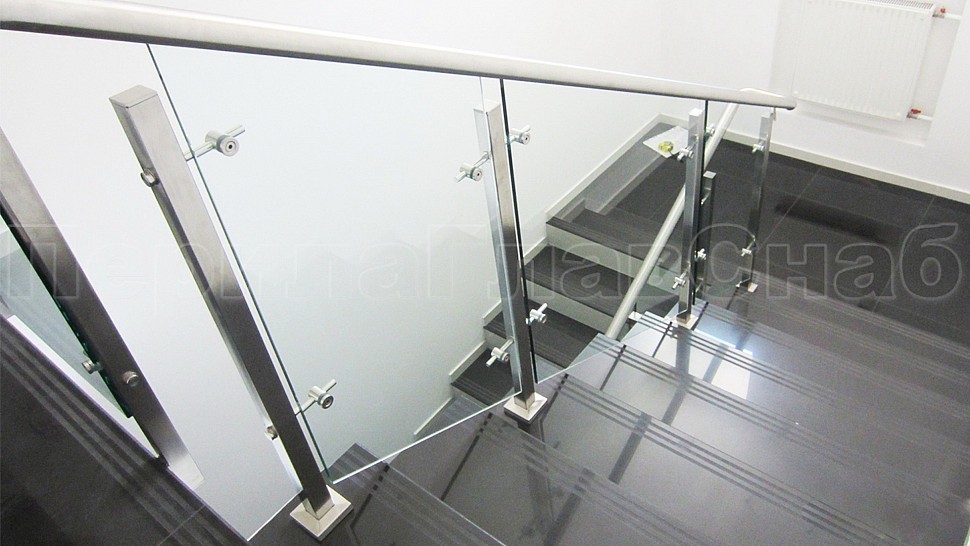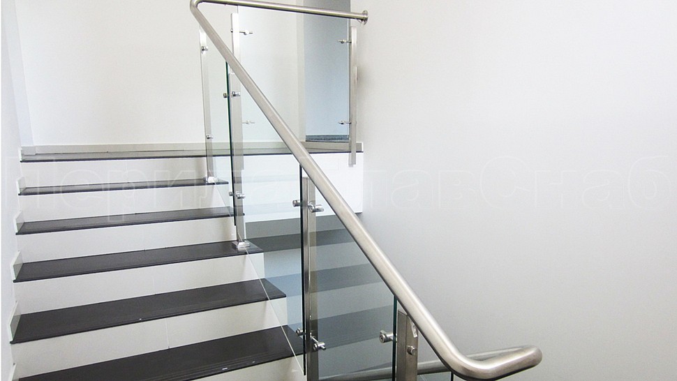 В административно-офисное помещение было установлено стильное лестничное ограждение из нержавеющей стали высотой 950 мм с закаленным прозрачным стеклом 10 мм, с точечными стеклодержетелями на выносе, поручнем диаметром 48 мм с пазом из нержавеющей шлифованной стали; стойки диаметром 40 мм устанавливаются через две ступени на третью с торца. Верх стойки заглушка, низ стойки 80х80 мм.