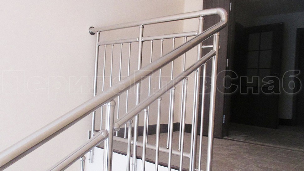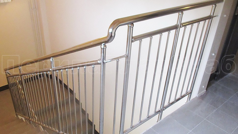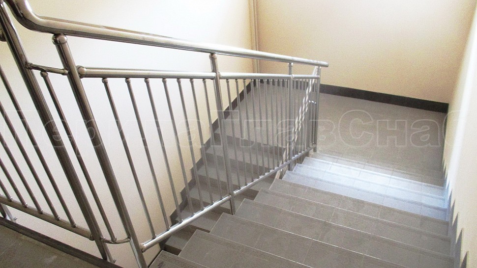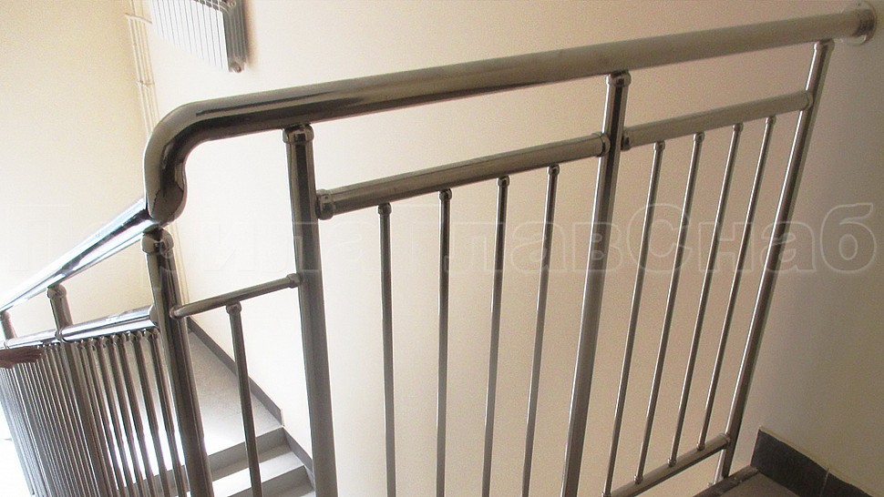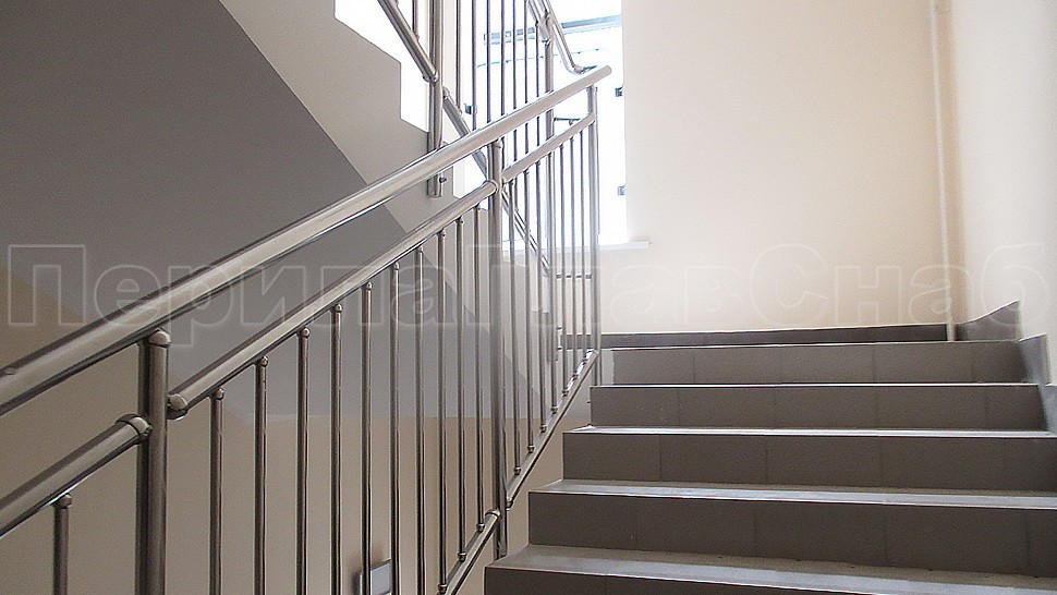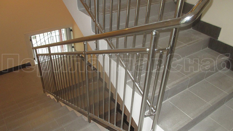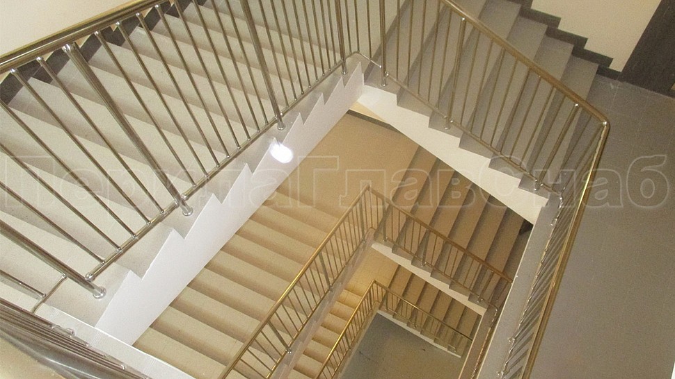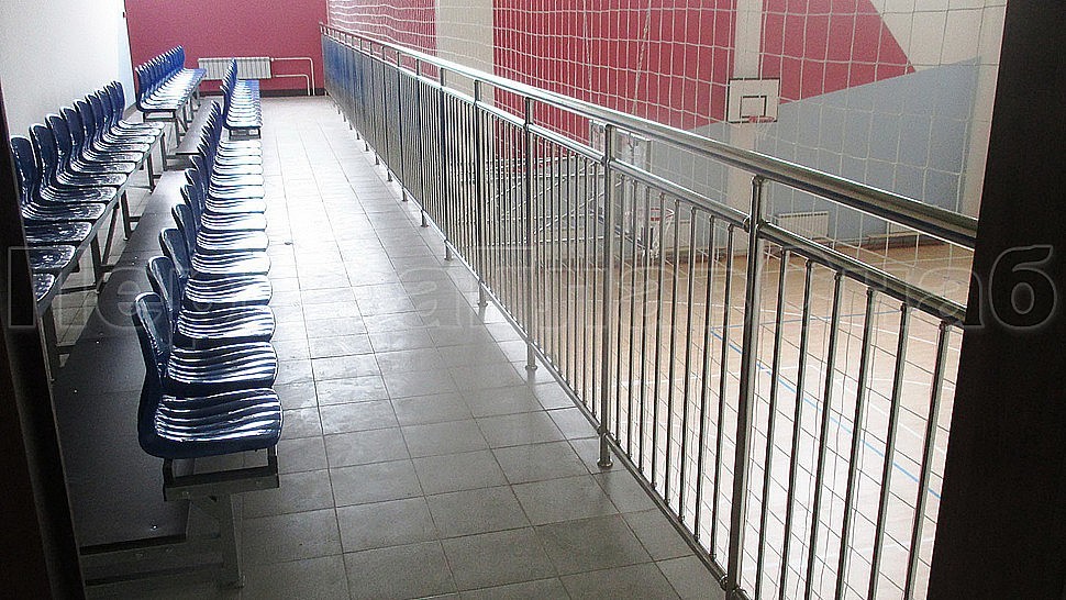Были установлены ограждение центральной лестницы и спортивного зала из полированной нержавеющей стали высотой 1400 мм. с поручнем диаметром 50,8 мм. и стойками диаметром 38,1 мм., которые крепится в ступени сверху сквозь плитку с вклеиванием и с шагом через две ступени на третью в горизонте с шагом 900-1200 мм. Поручни завязаны между маршами нержавеющими отводами диаметром 50 мм. Верх стойки штампованный, низ стойки декоративный диаметром 60 мм. Заполнение вертикальное между поручнем и нижней трубой диаметром 16 мм. с шагом кратно 100 мм. Все детали между собой крепятся на точечной аргонно-дуговой сварке и отполированы до блеска.