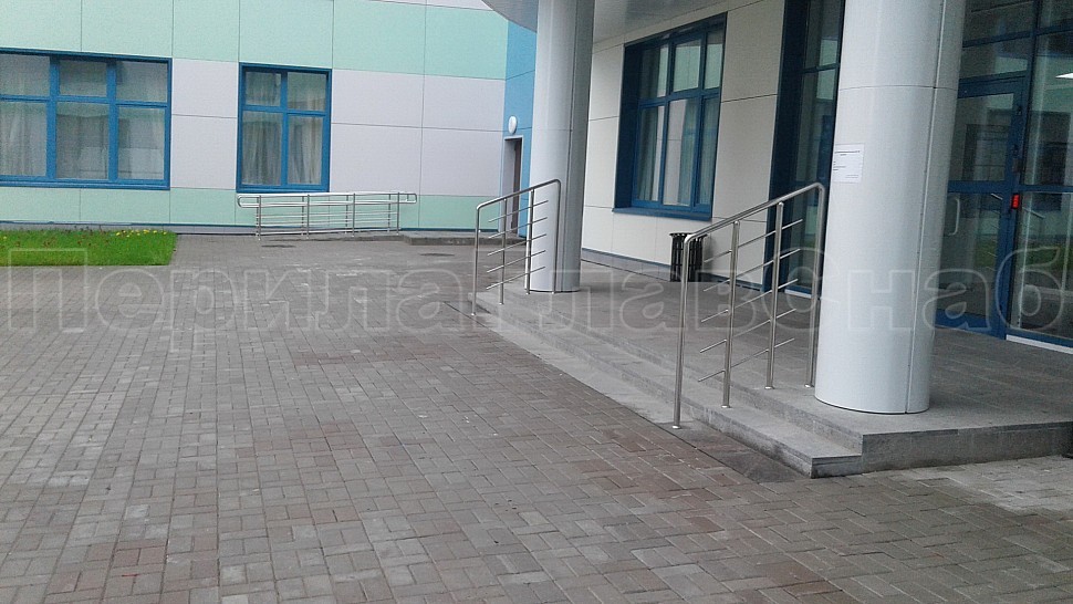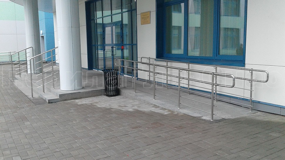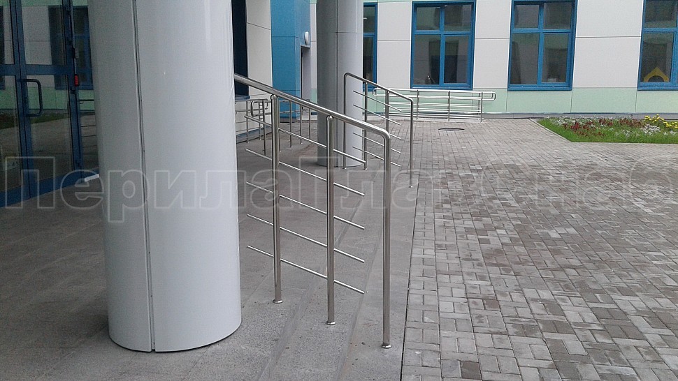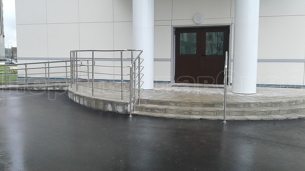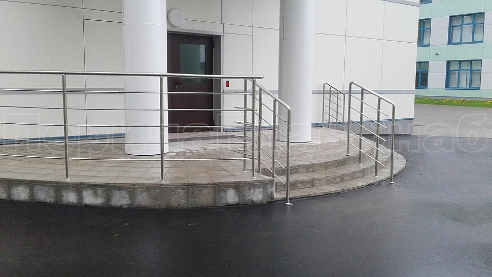 Снаружи здания были установлены ограждения на крыльце из полированной нержавеющей стали высотой 1200 мм. Труба стоек диаметром 38 мм крепится в бетонную поверхность методом алмазного бурения на глубину 70 мм, диаметр отверстия 42 мм. Установлены на расстоянии 300 мм друг от друга. Между стойками установлены пять ригелей горизонтальным заполнением, диаметр ригельной трубки 16мм, крепятся к стойкам при помощи сварки.