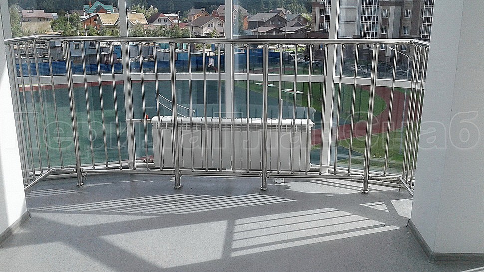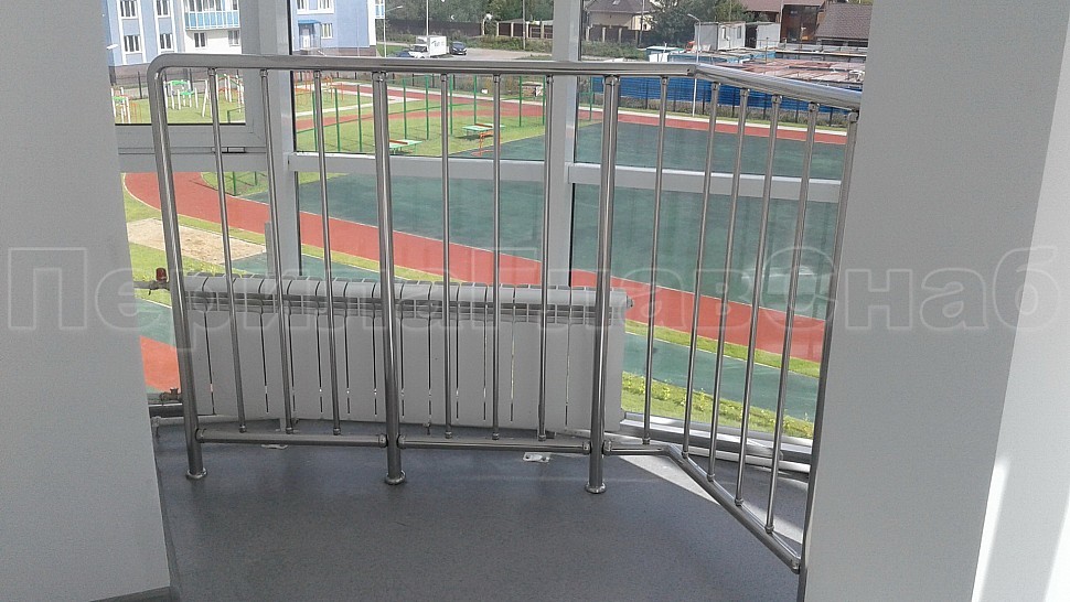 • Ограждения витражей зимних садов выполнены из полированной нержавеющей стали марки AISI 304 высотой 1200 мм от пола. Стойки трубой диаметром 38 мм крепятся в пол на глубину 70 мм при помощи бурения, установлены друг от друга на расстоянии 1000-1200 мм друг от друга. Между стоек вертикальным способом установлены ригели, диаметр трубки 16 мм. Вставляются в пазы перфорированной трубы с шагом 100 мм.