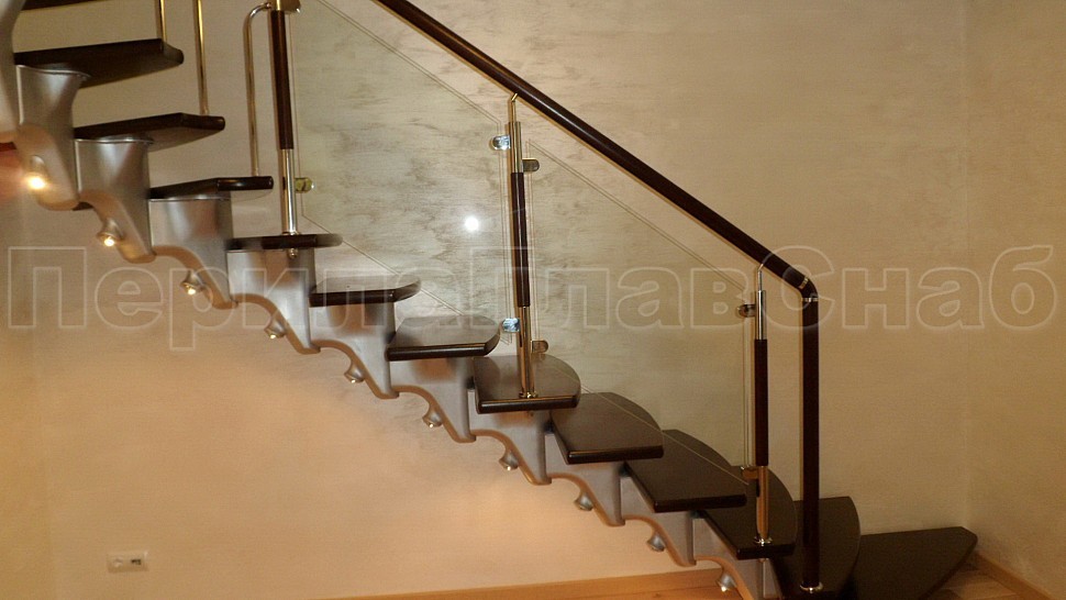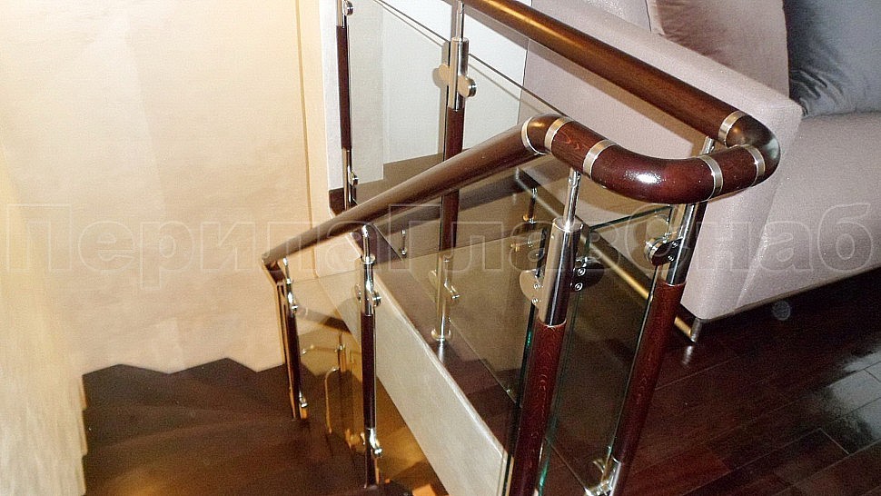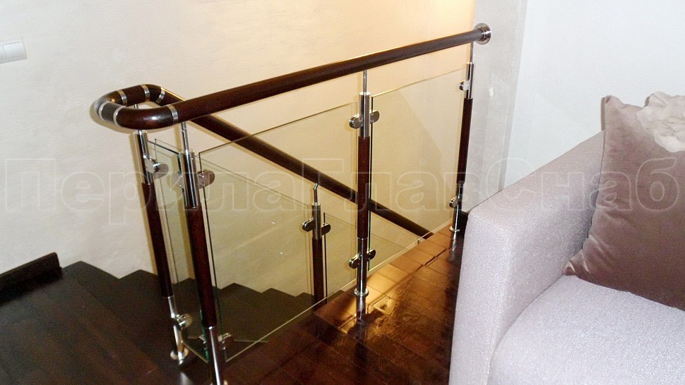 В загородный дом были установлены ограждения из полированной нержавеющей стали с прозрачным каленым стеклом 8 мм, с зажимными стеклодержетелями, с деревянным дубовым поручнем диаметром 50 мм; стойки диаметром 50 мм из полированной нержавеющей стали с деревянными вставками устанавливаются через две ступени на третью.