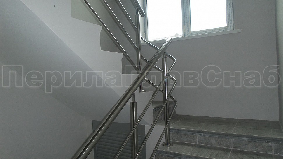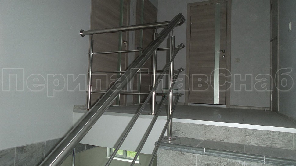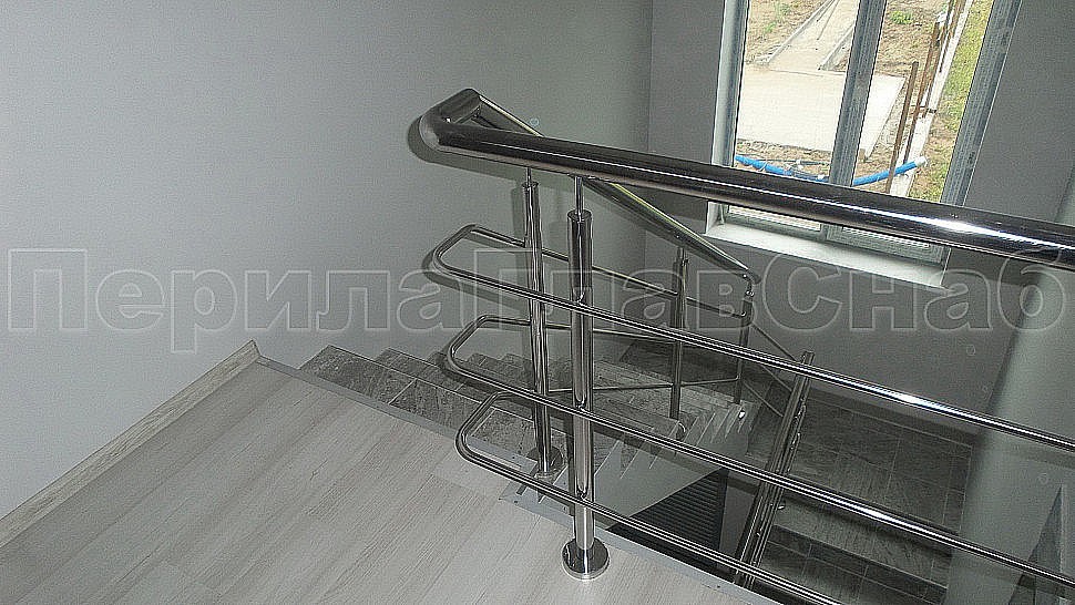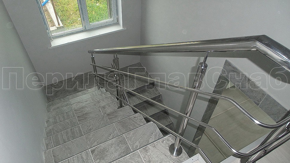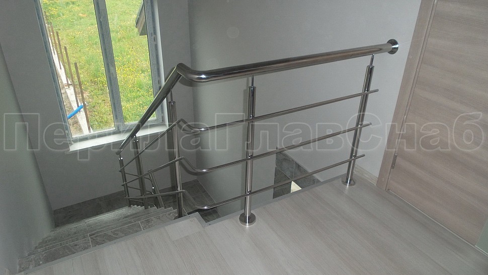 В загородном доме было установлено трехригельное ограждение из полированной нержавеющей стали. Высотой 950 мм, стойками диаметром 38 мм, креплением сверху на трех анкерную закладную на площадке, на маршах крепление торцевое методом бурения диаметром 12 мм на глубину 50-70 мм, на анкер-болт с колпачковой гайкой.
