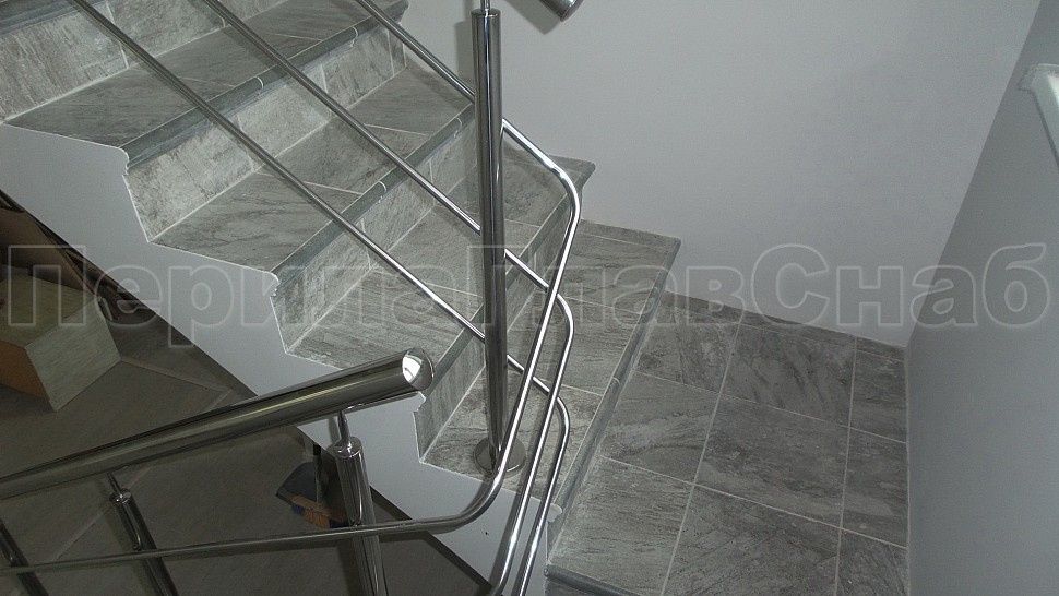 Сквозь стойку с заранее просверленными отверстиями, устанавливаются через три ступени в четвертую, на прямых участках не более 1250 мм друг от друга, наконечник стойки штырь; ригель диаметром 16 мм, ригель крепится к стойке сваркой снизу, низ стойки декоративная крышка диаметром 56 мм, поручень труба диаметром 50 мм, окончание поручня заглушка, поручень завязан, ригель завязан. Крепление нержавеющих элементов ограждения между собой точечная аргонно-дуговая сварка, длина швов 2 мм, с последующей зачисткой и полировкой.