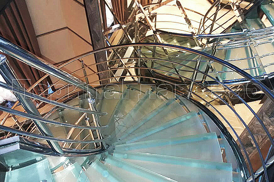 Винтовая лестница позволяет компактно расположить переход с этажа на этаж и сделать помещение более просторным. Закрученная конструкция из труб, выполненных из нержавеющей стали, дополнена стеклянными ступеньками, которые предоставляют простор для подсветки и общего оживления интерьера.Жесткость конструкции получена благодаря применения тетив из толстого металла, который прокатан по винту и обшит декоративным листом из полированной нержавеющей стали. Тетива — основной несущий элемент, к которому крепятся ступени.