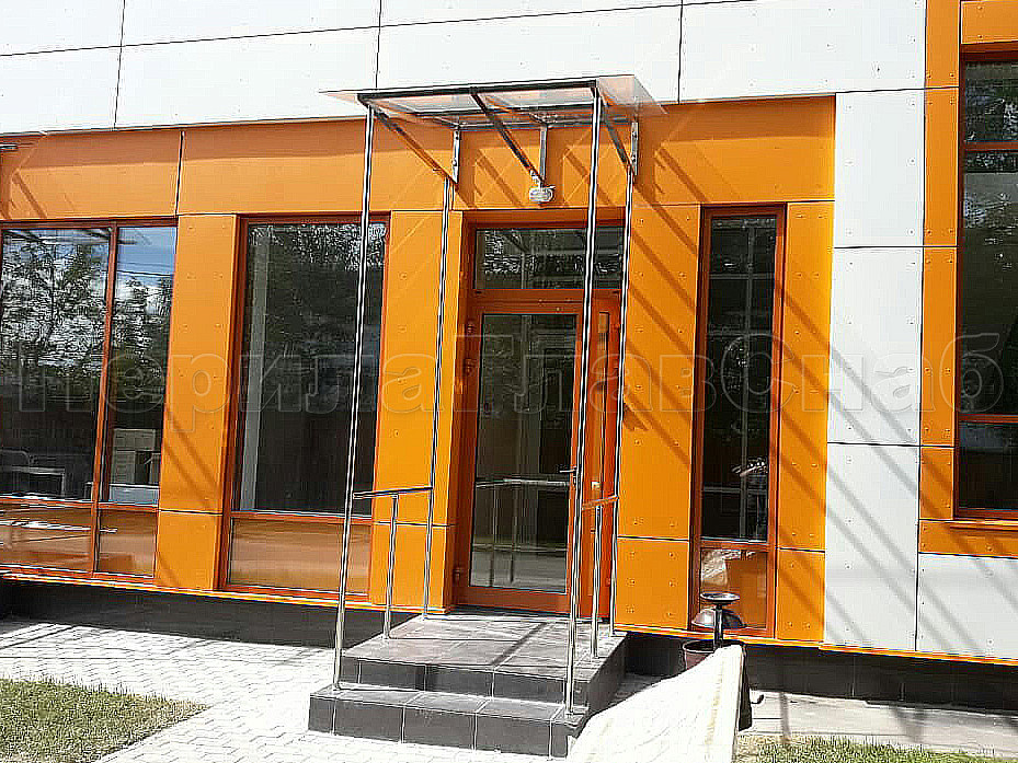 Здание очень яркое и заметное, а наши козырьки очень выгодно сочетаются с оранжевым цветом здания. Конструктив: козырек односкатный (от стены) над приямком из полированной нержавеющей стали марки AISI-304. Рама труба 40х40х1,5мм. Опорные стойки на ограждения приямков труба Ф50,8х1,5мм опираются на стойки ограждения.