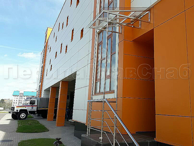 Установили в здании МЧС вот такие козырьки из поликарбоната с рамой из нержавеющей стали. Несмотря на то, что покрытие козырька - это прозрачный литой поликарбонат, толщиной 6 мм, смотрится со стороны, как будто стекло.