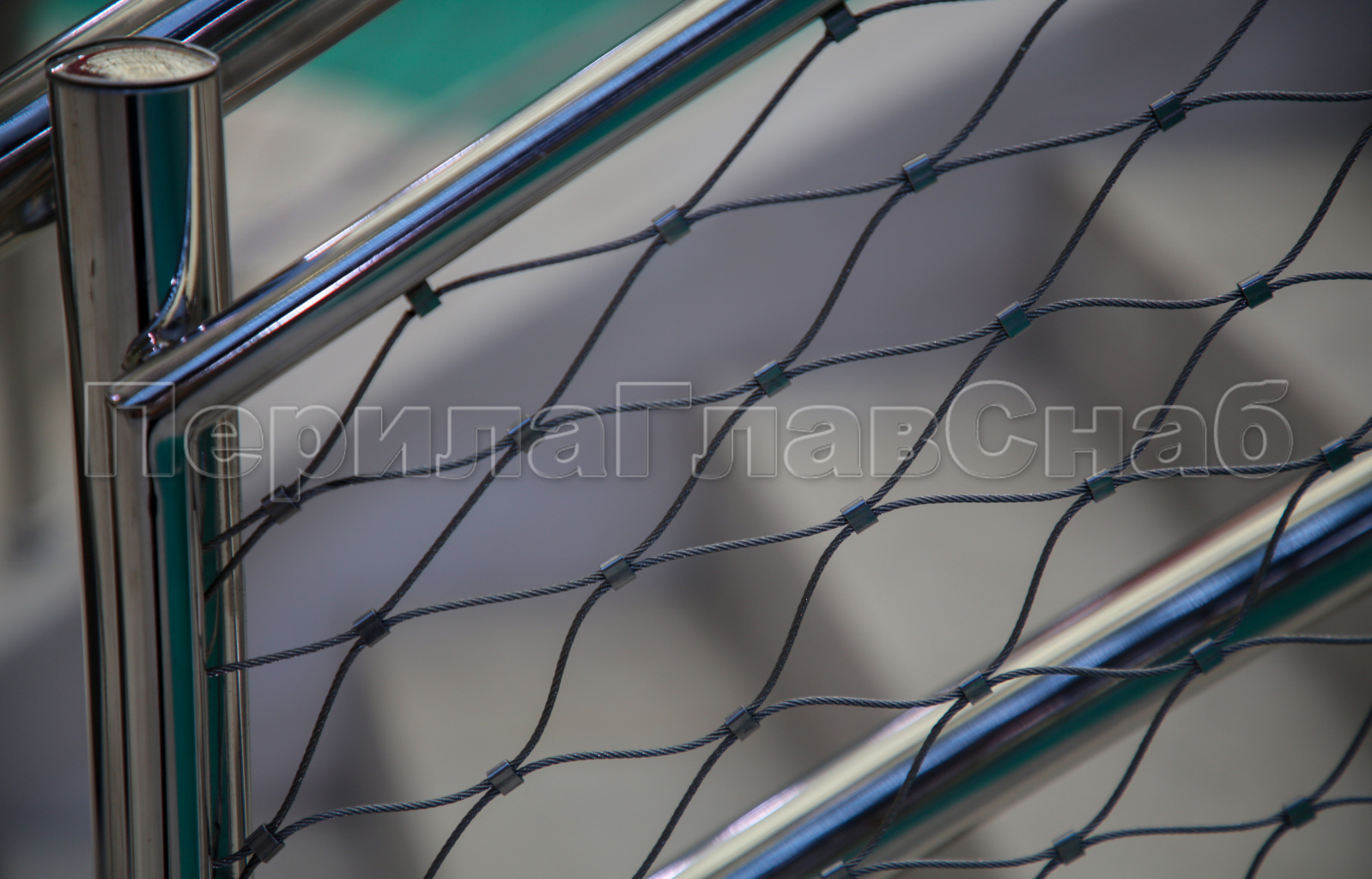 Так же на данном объекте нами были установлены ограждения из полированной нержавеющей стали конструктив которых состоял из стойки диаметром 38мм, двойного поручня такого же диаметра, завязанного между собой с заполнением между стоек сеткой. Сетка была смонтирована точечной сваркой. Каждый пучок тросов приваривался после натяжения к металлической конструкции, что потребовало кропотливой и трудоемкой работы монтажников. Все сварные швы ограждения так же были зачищены и заполированы.
