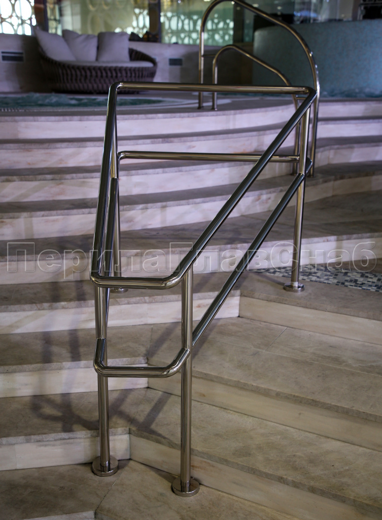 Для придания плавности линий и отсутствия острых углов поручня, были отдельно изготовлены отводы с разными радиусами, что сказалось на сложности изготовления и монтажа поручней. Все швы поручня были обварены по кругу, тщательно зачищены и заполированы.
