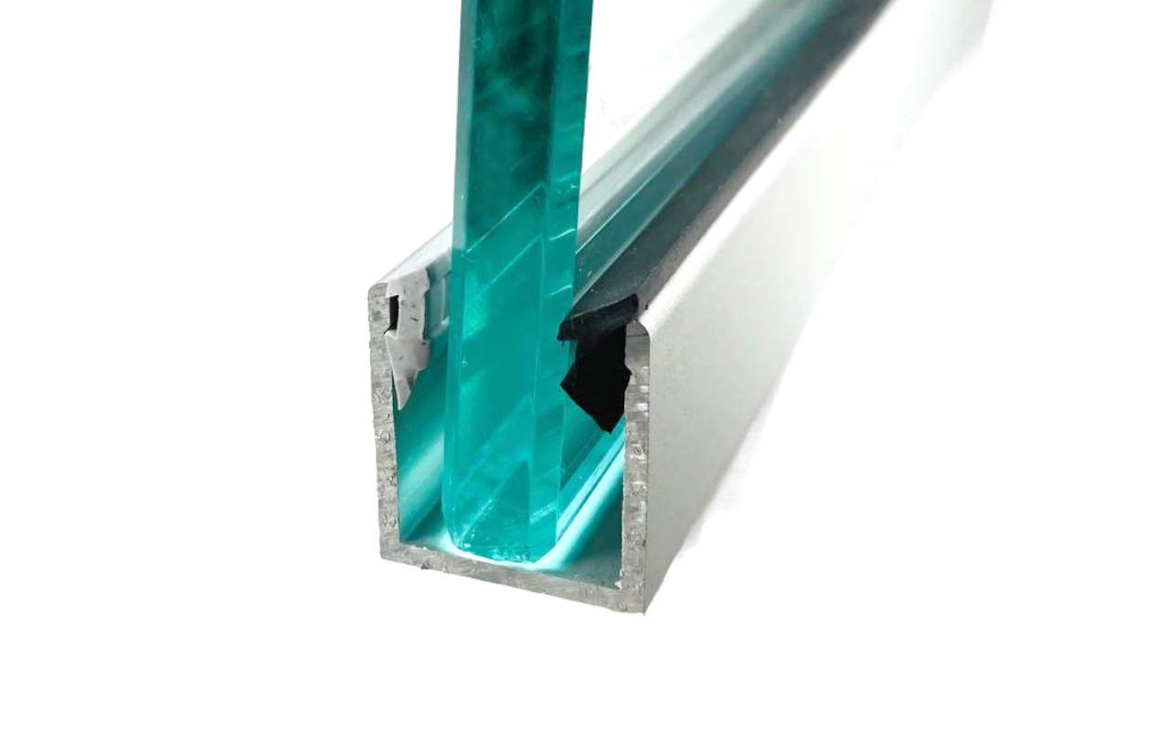 Нижний опорный профиль монтируется в пол на саморезы, затем в него устанавливается стекло. После этого по краям фиксируются уплотнительные резинки.