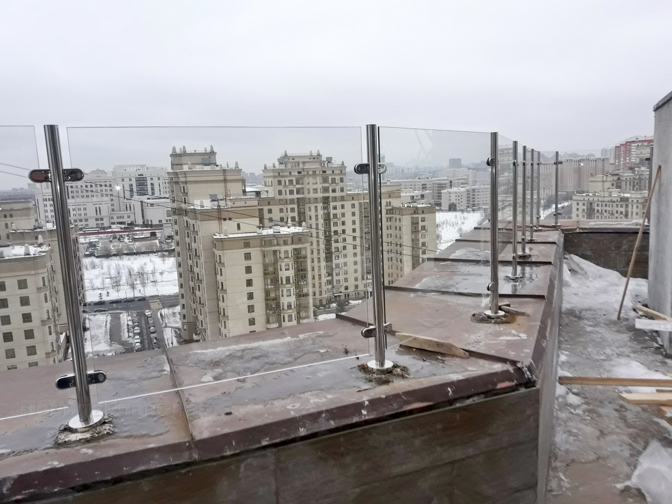 Стеклянные ограждения кровли со стойками на крыше многоэтажного дома. Дешевый аналог.