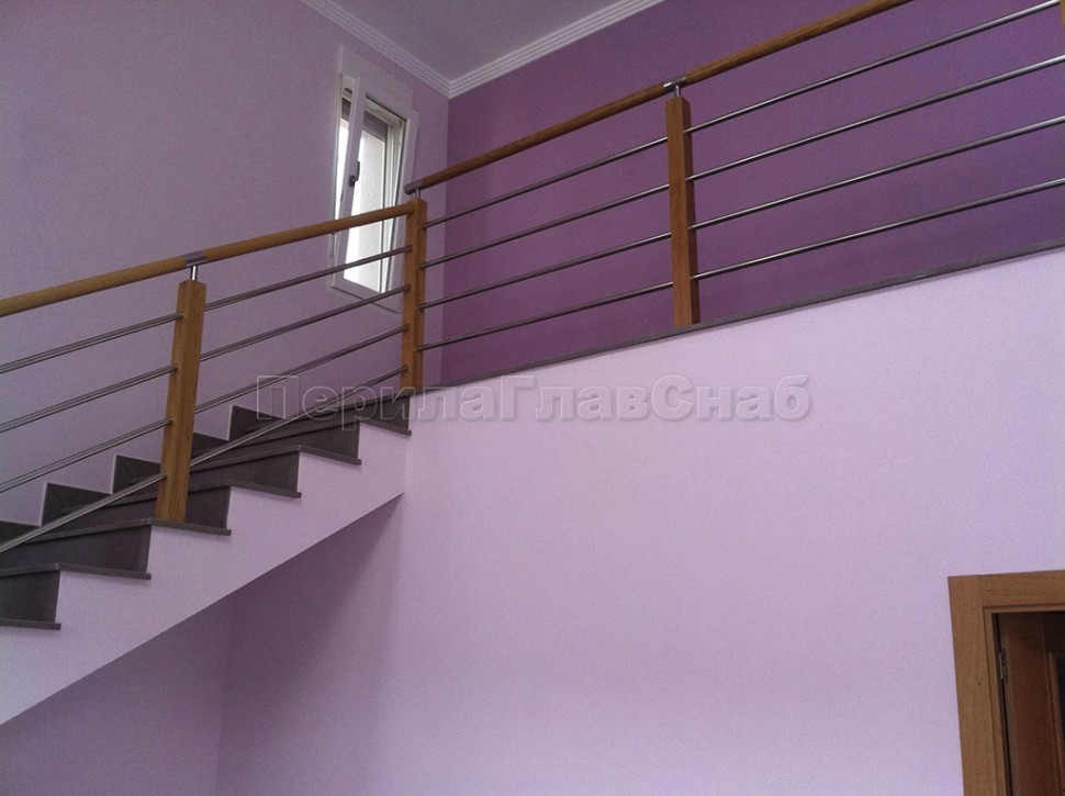 Три ригеля на сварке, квадратный деревянный поручень и круглые стойки