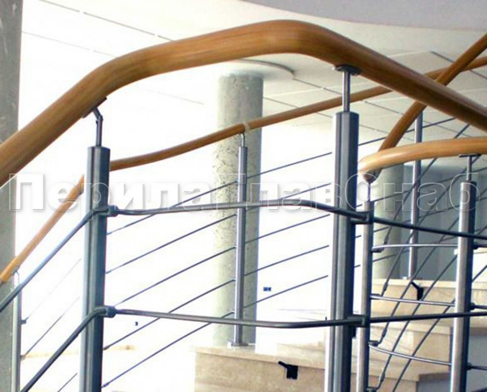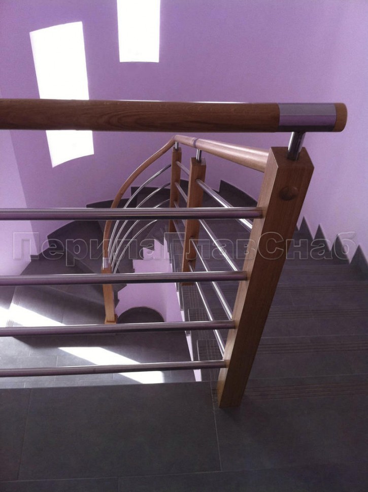 Нержавеющие ограждения без ригелей с круглым деревянным поручнем и стойками с деревянными вставками