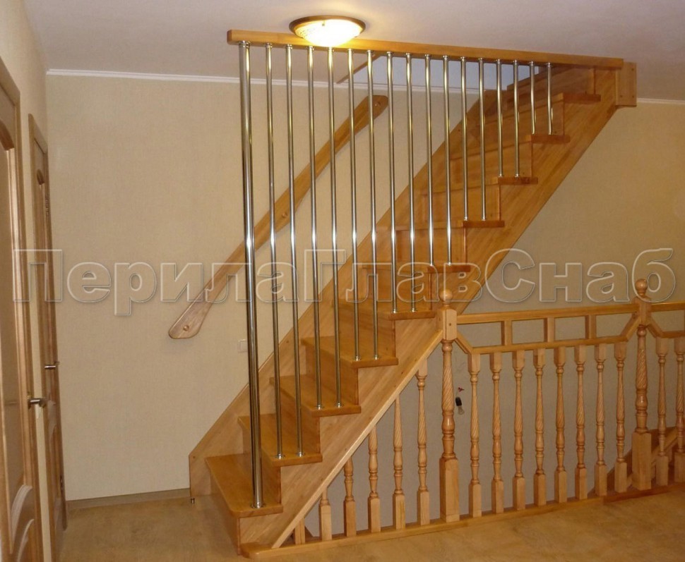 Ограждения со стойками в каждую ступень с круглым деревянным поручнем без ригелей