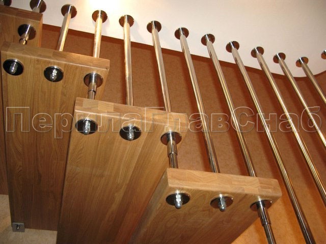 Нержавеющие ограждения без ригелей с круглым поручнем и стойками с деревянными вставками