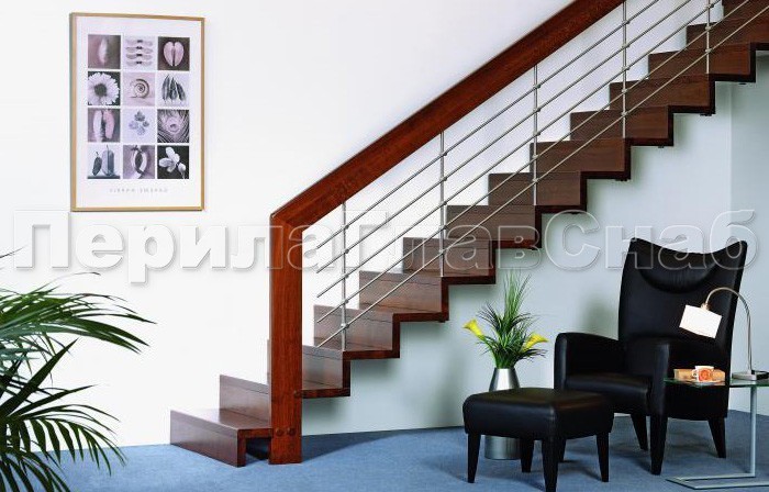 Ограждения с двумя стойками в каждую ступень с деревянным поручнем и без ригелей
