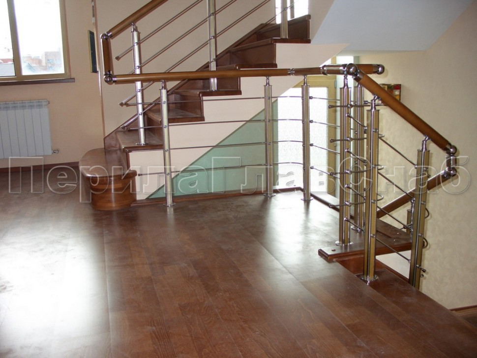 Нержавеющие ограждения без ригелей с круглым деревянным поручнем и стойками с деревянными вставками